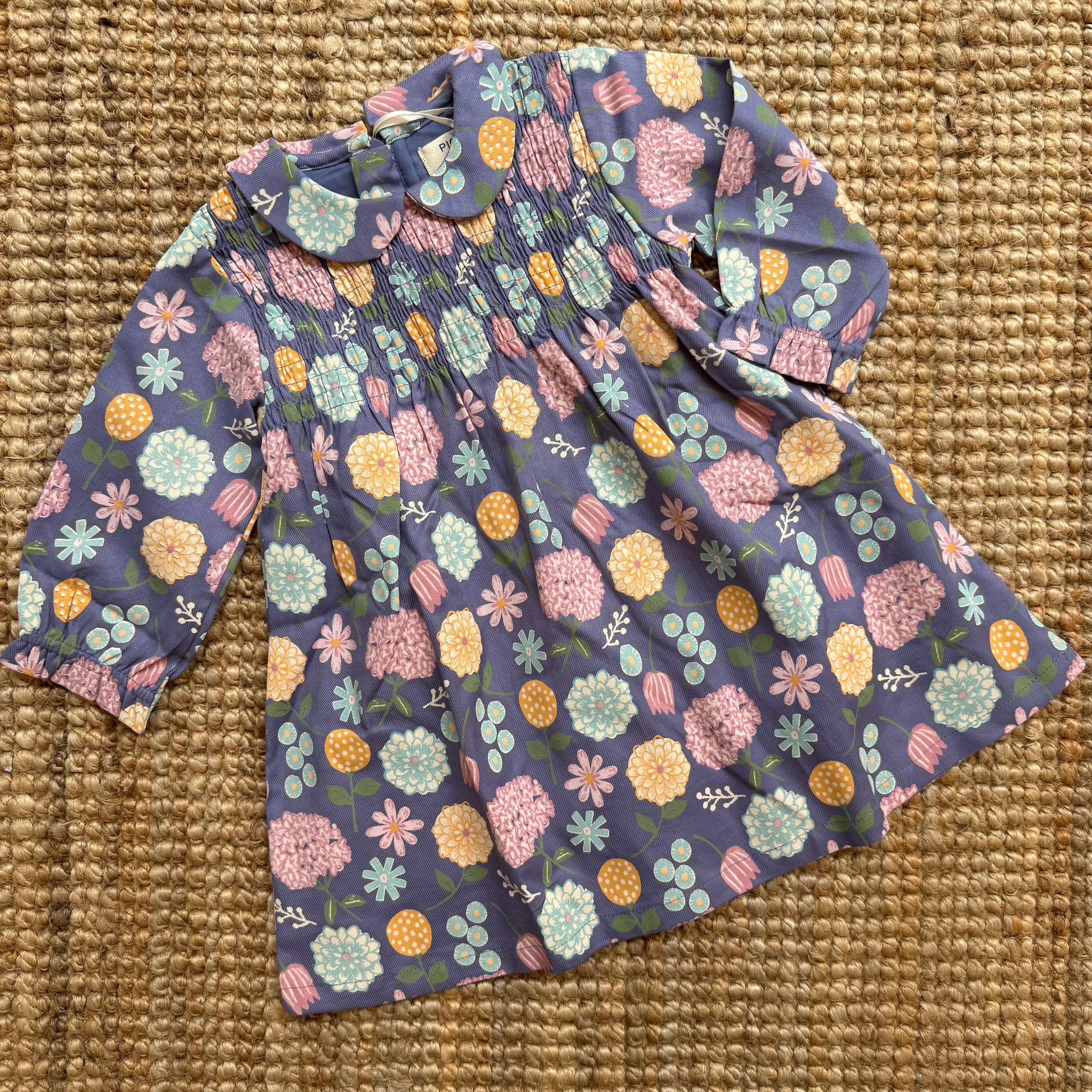 Abito fiori blu colletto rotondo e ricamo smock 25SMODWBL