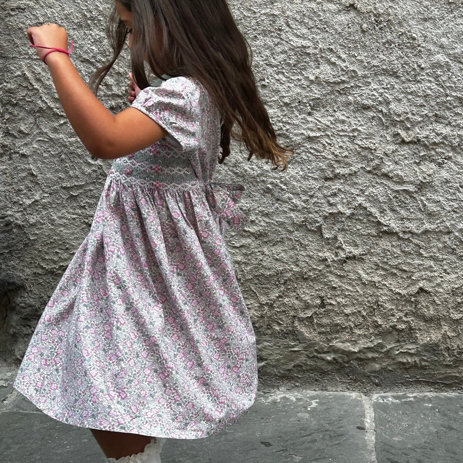 Abito fiori rosa colletto rotondo e ricamo smock 25SMODLA