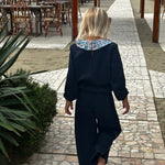 Completo LAB in felpa garzata french terry composto da casacca con colletto frill fantasia (non rimovibile) e coulisse, abbinata e pantalone a palazzo con pences