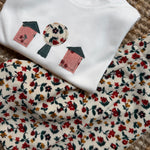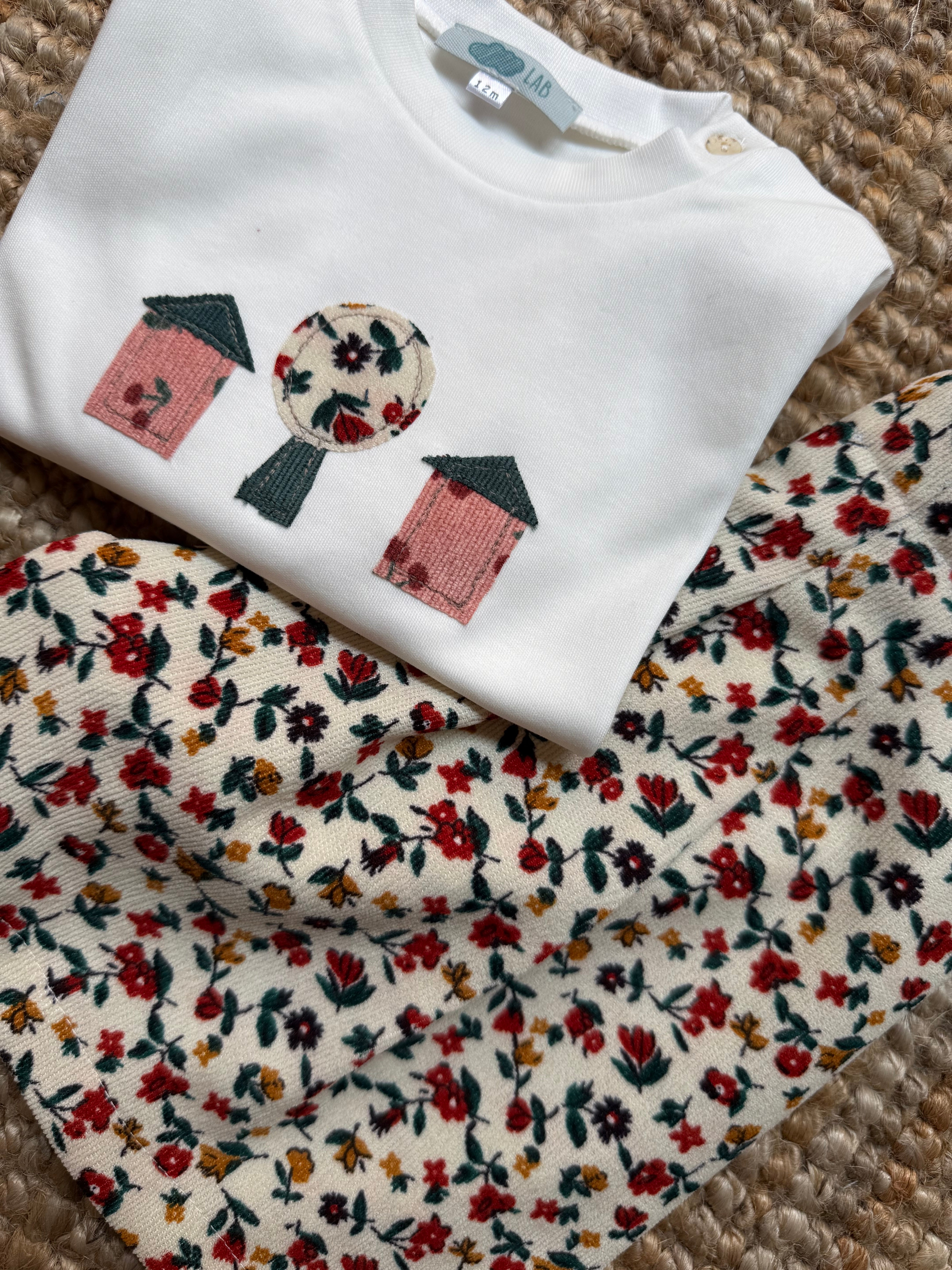 T-shirt girocollo con bottoncini su spalla con patch frontali fantasia