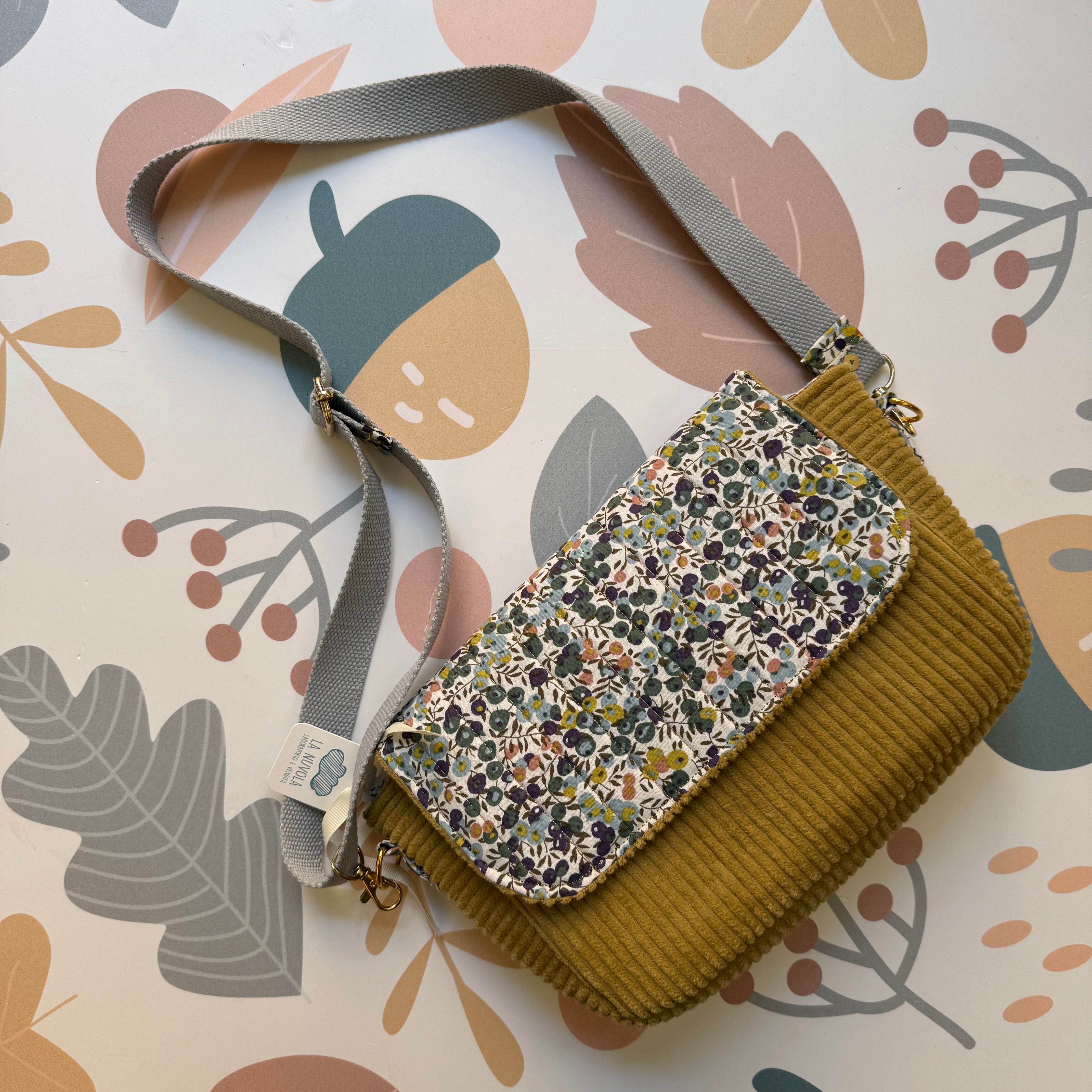Tracolla patchwork LAB velluto mostarda + bacche e fiorellini