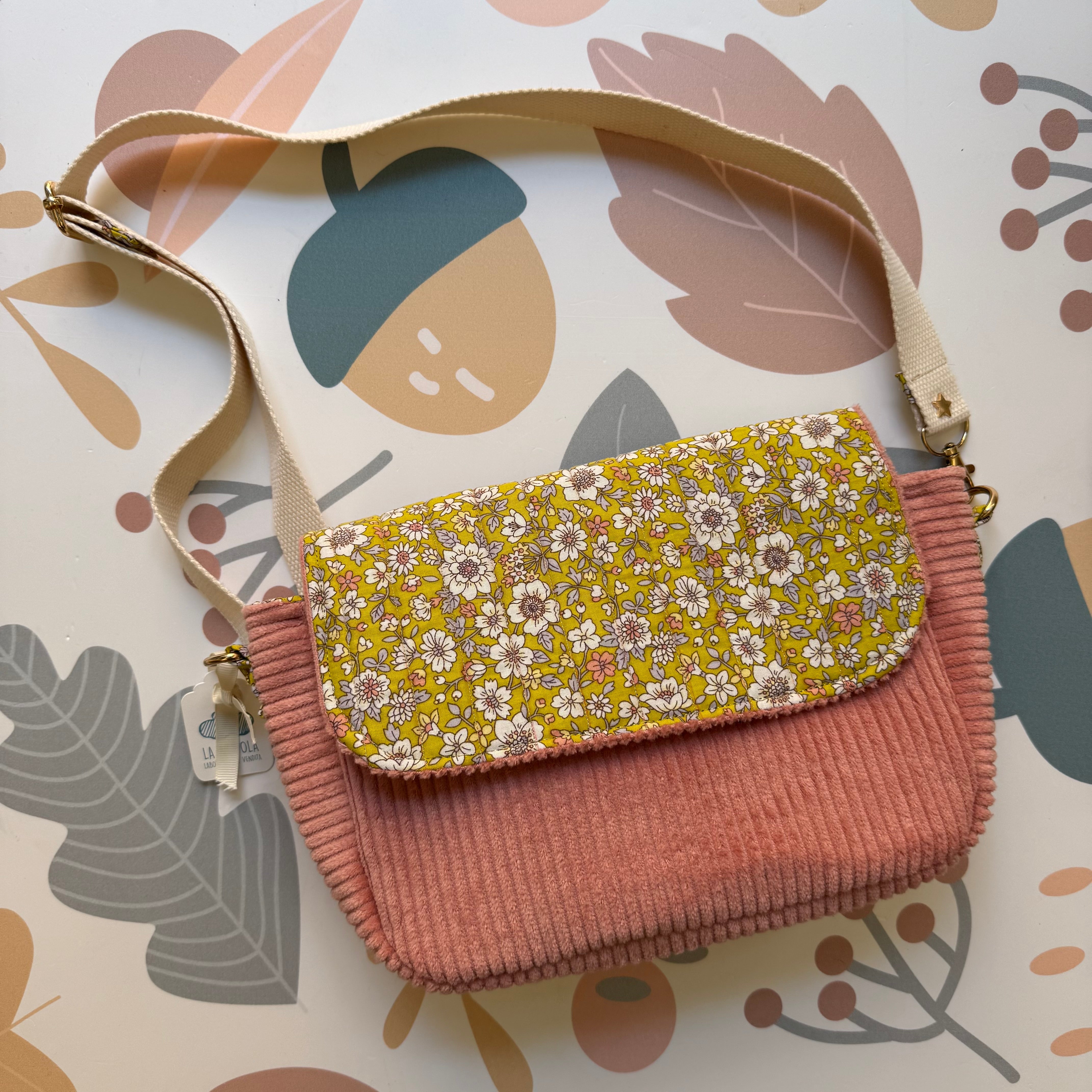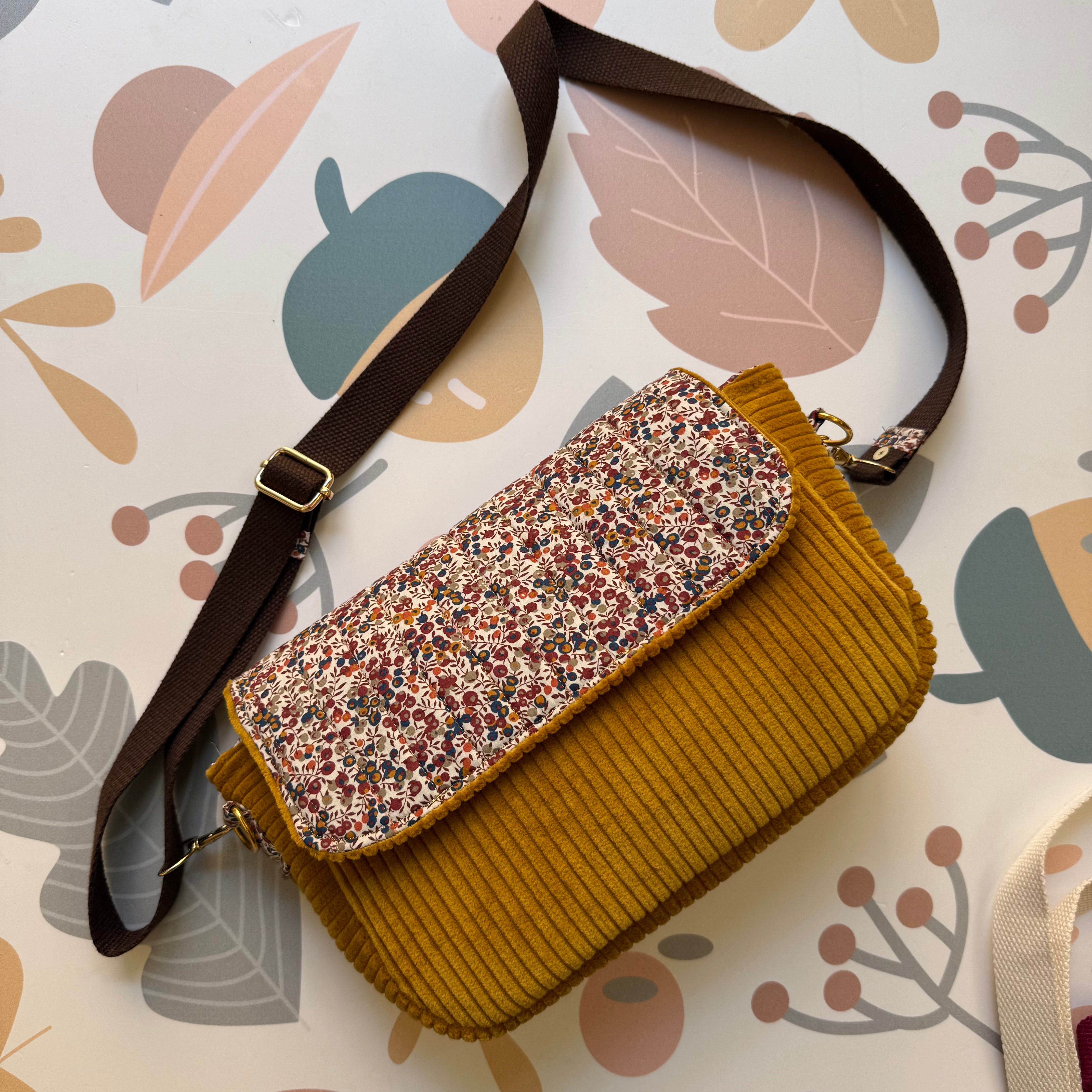 Tracolla patchwork LAB velluto mostarda + bacche e fiorellini