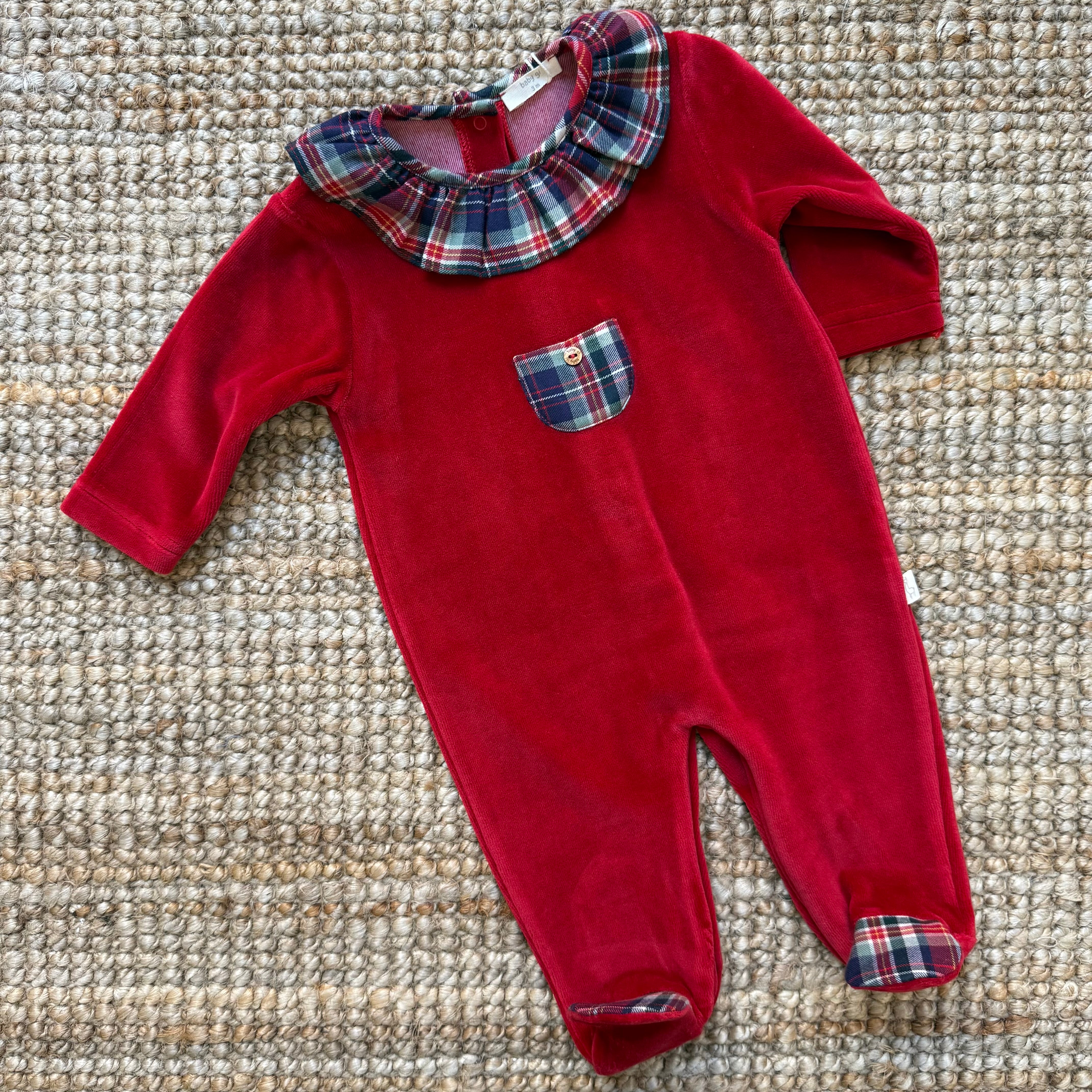 Tutina in ciniglia rosso con colletto frill e dettagli tartan PR50G