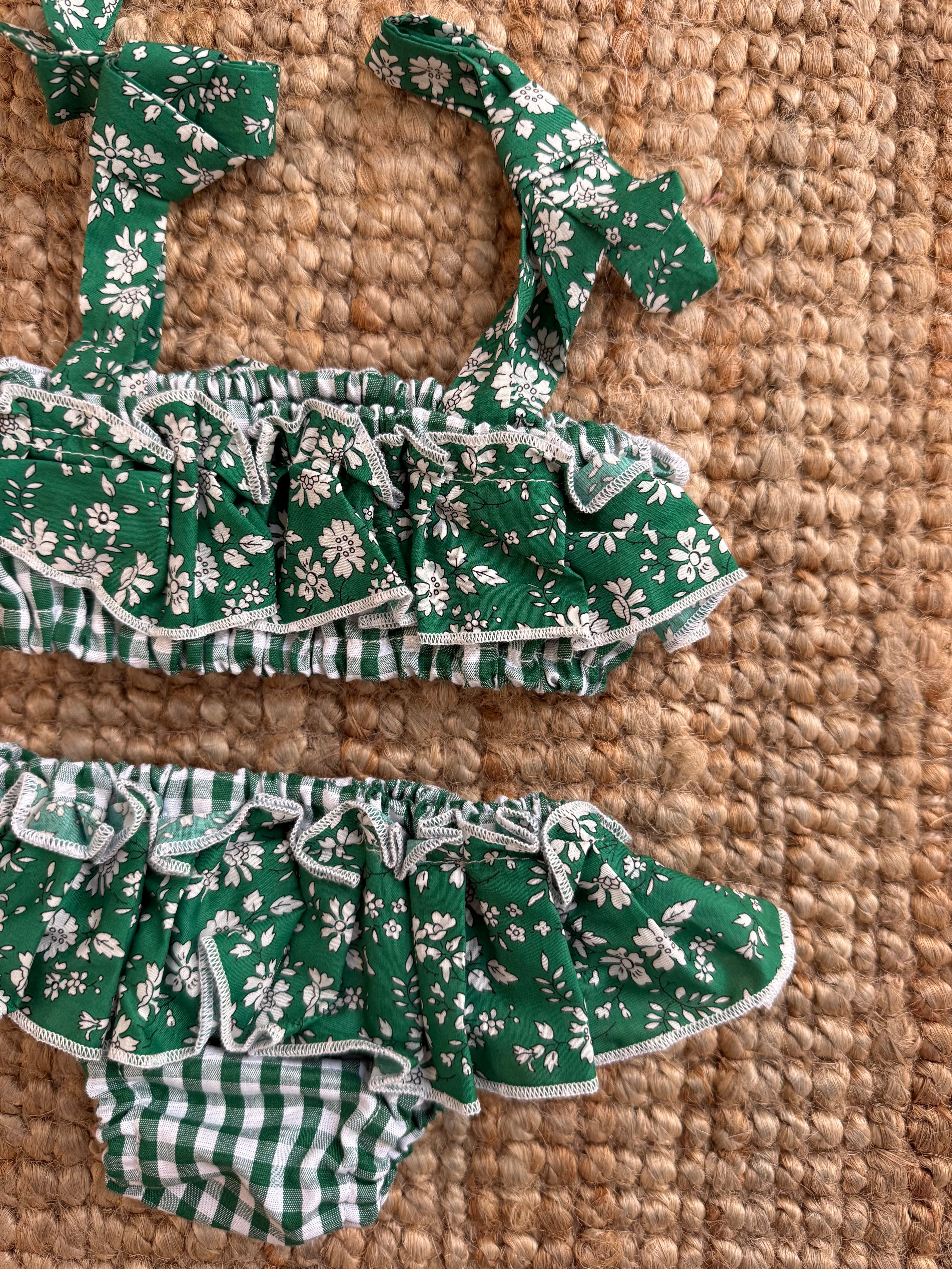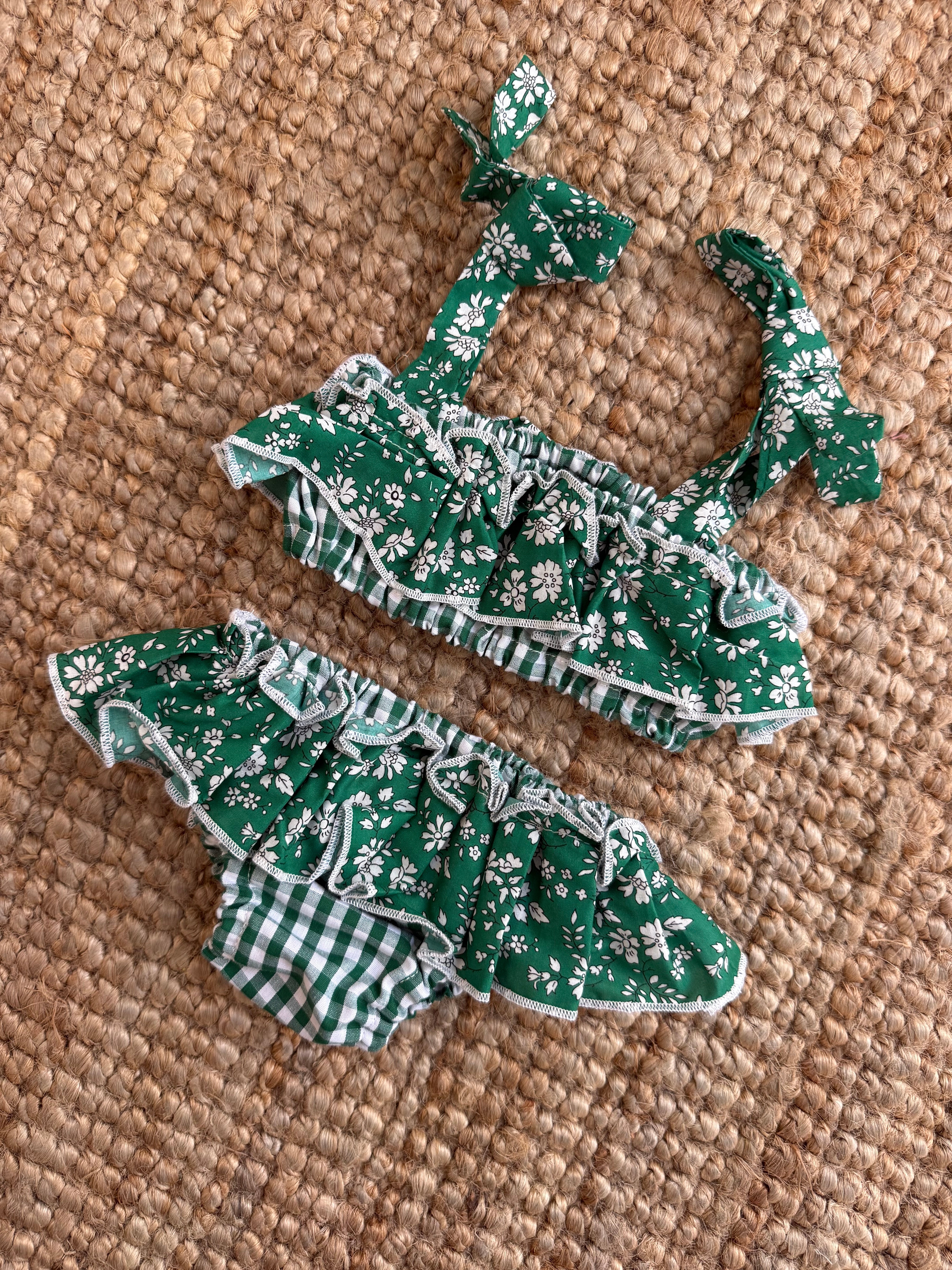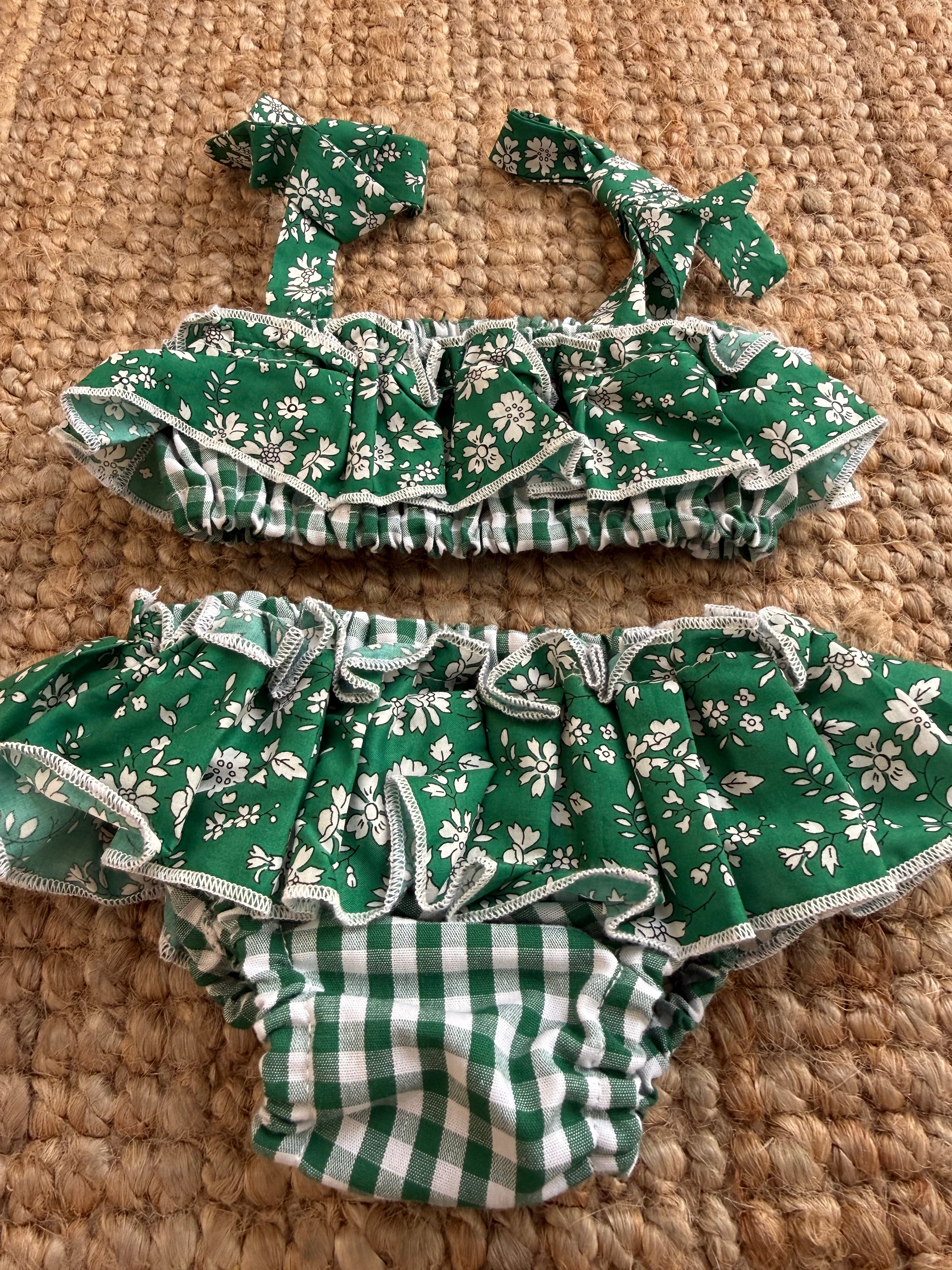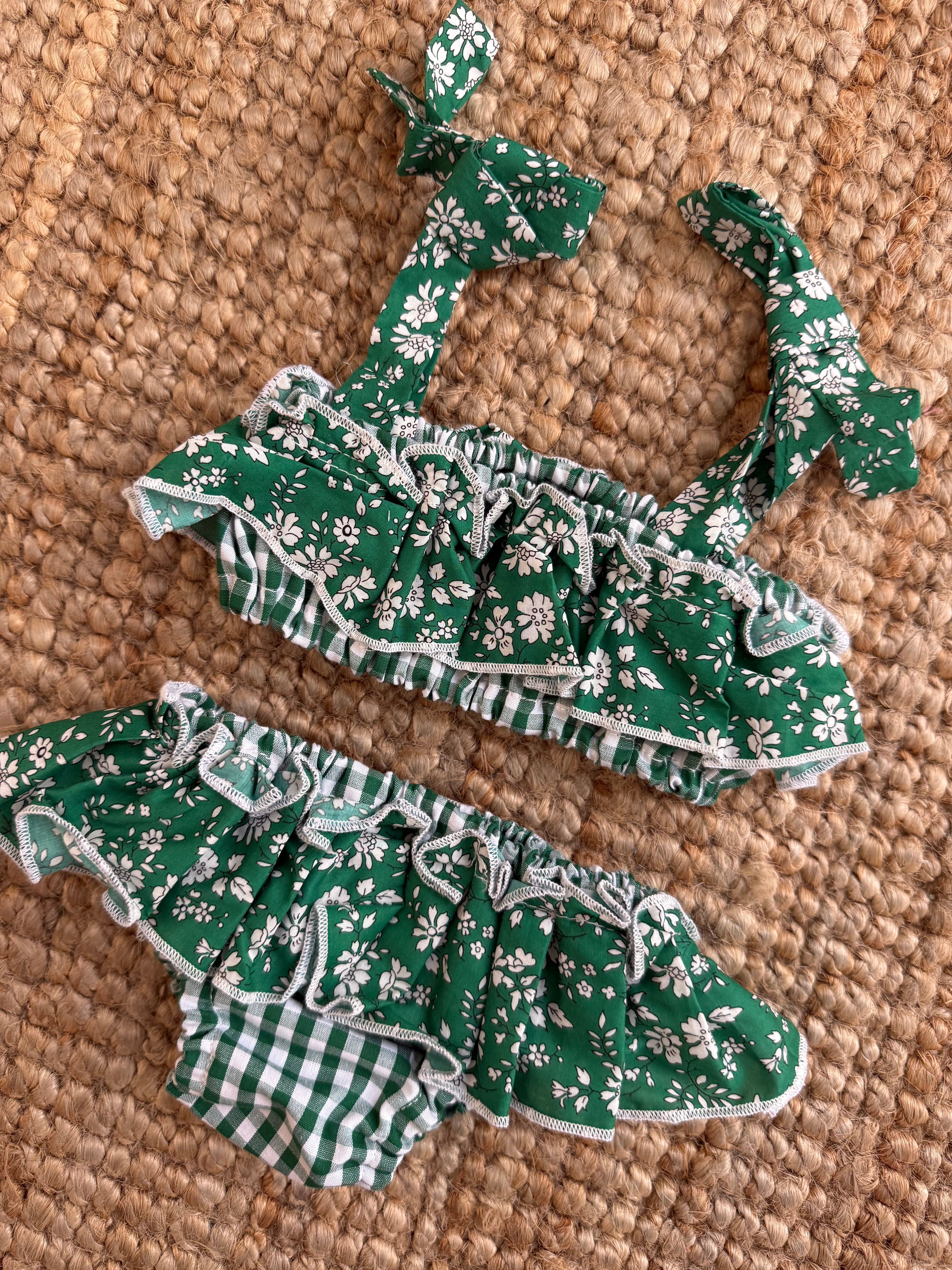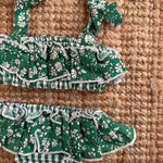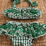 Costume LAB bikini in cotone vichy verde e bianco con rouches fiorellini