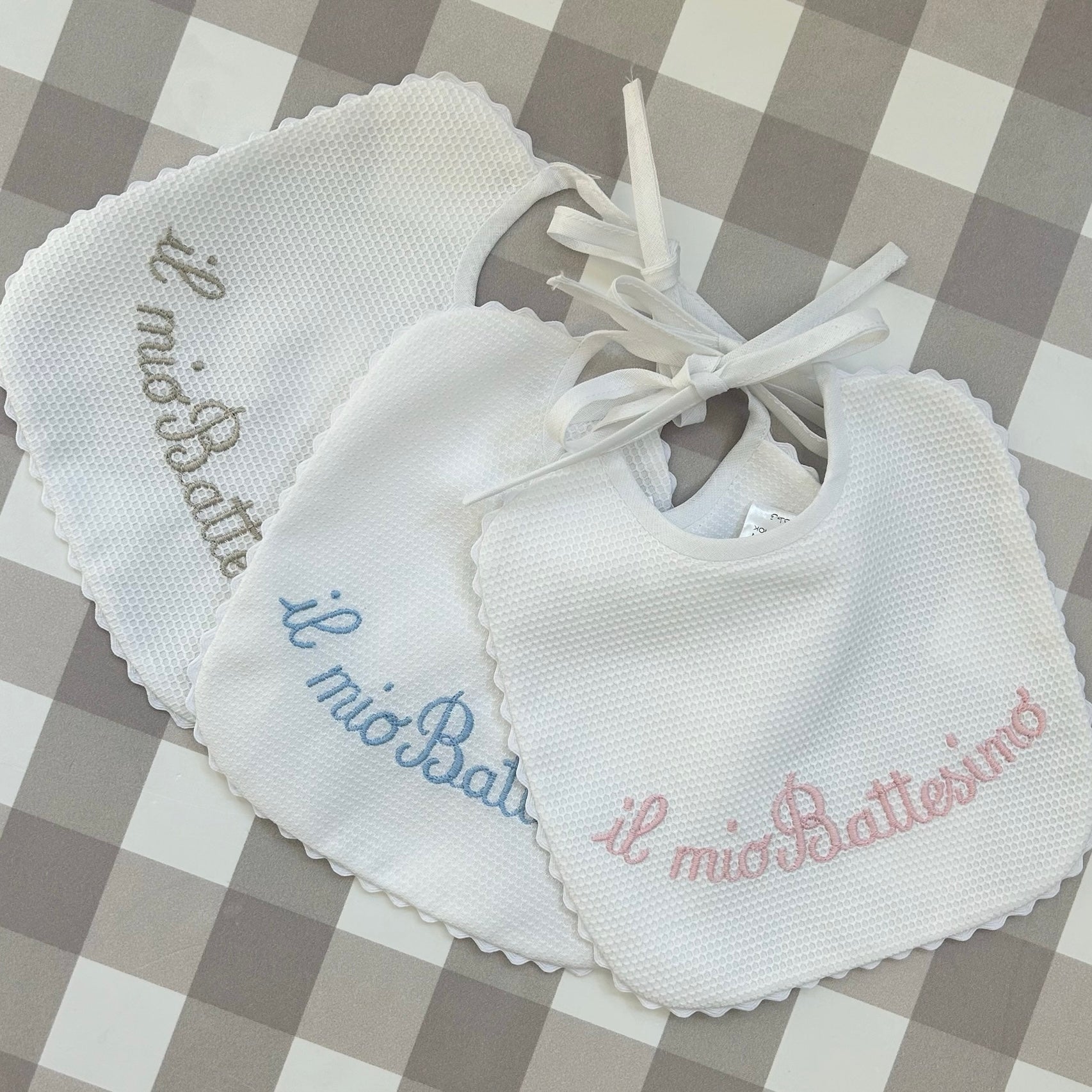 Bavaglino piquet con bordatura serpentina e ricamo Il mio Battesimo