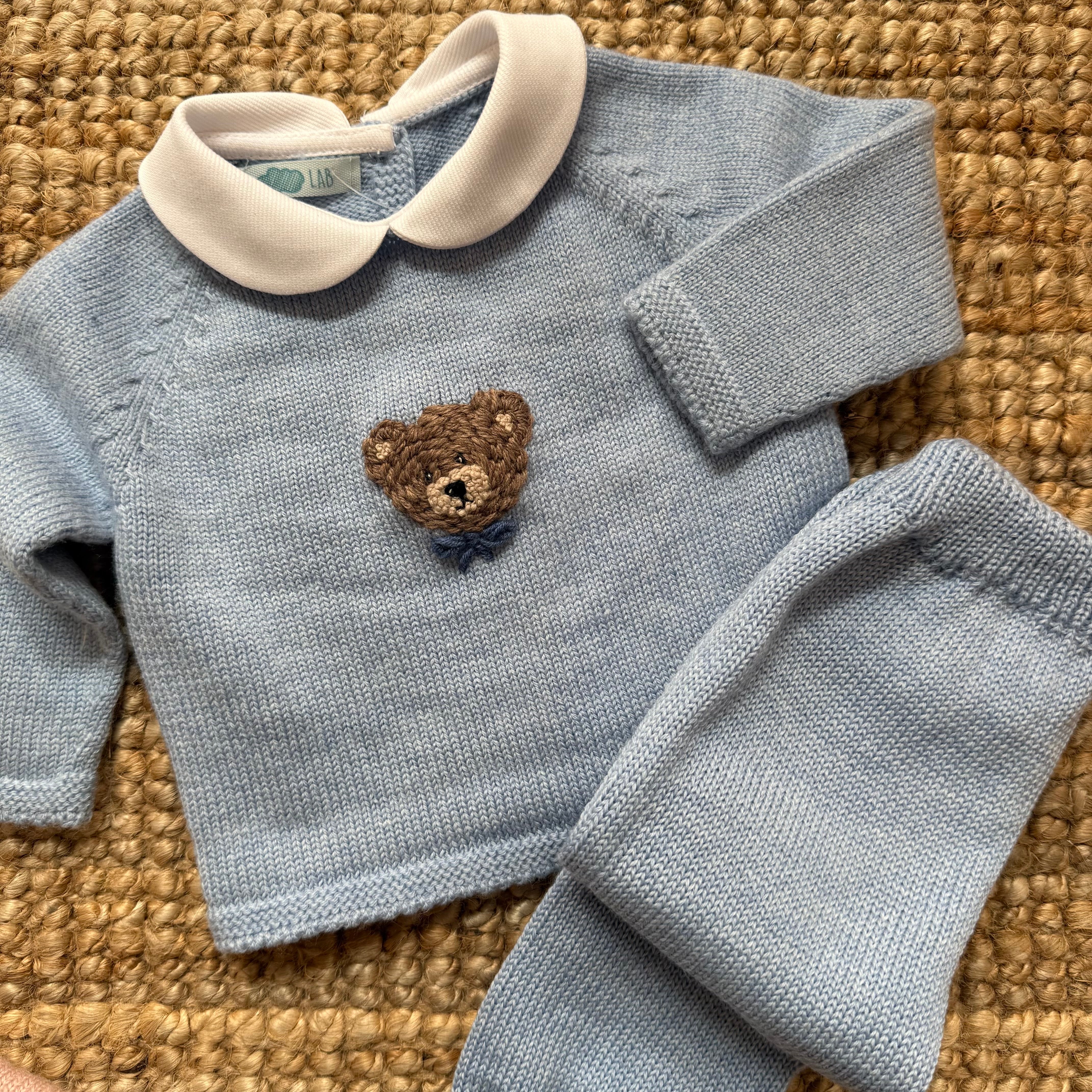 Completo azzurro con colletto tondo e ricamo orsetto Mi Lucero x LA NUVOLA LAB I25070