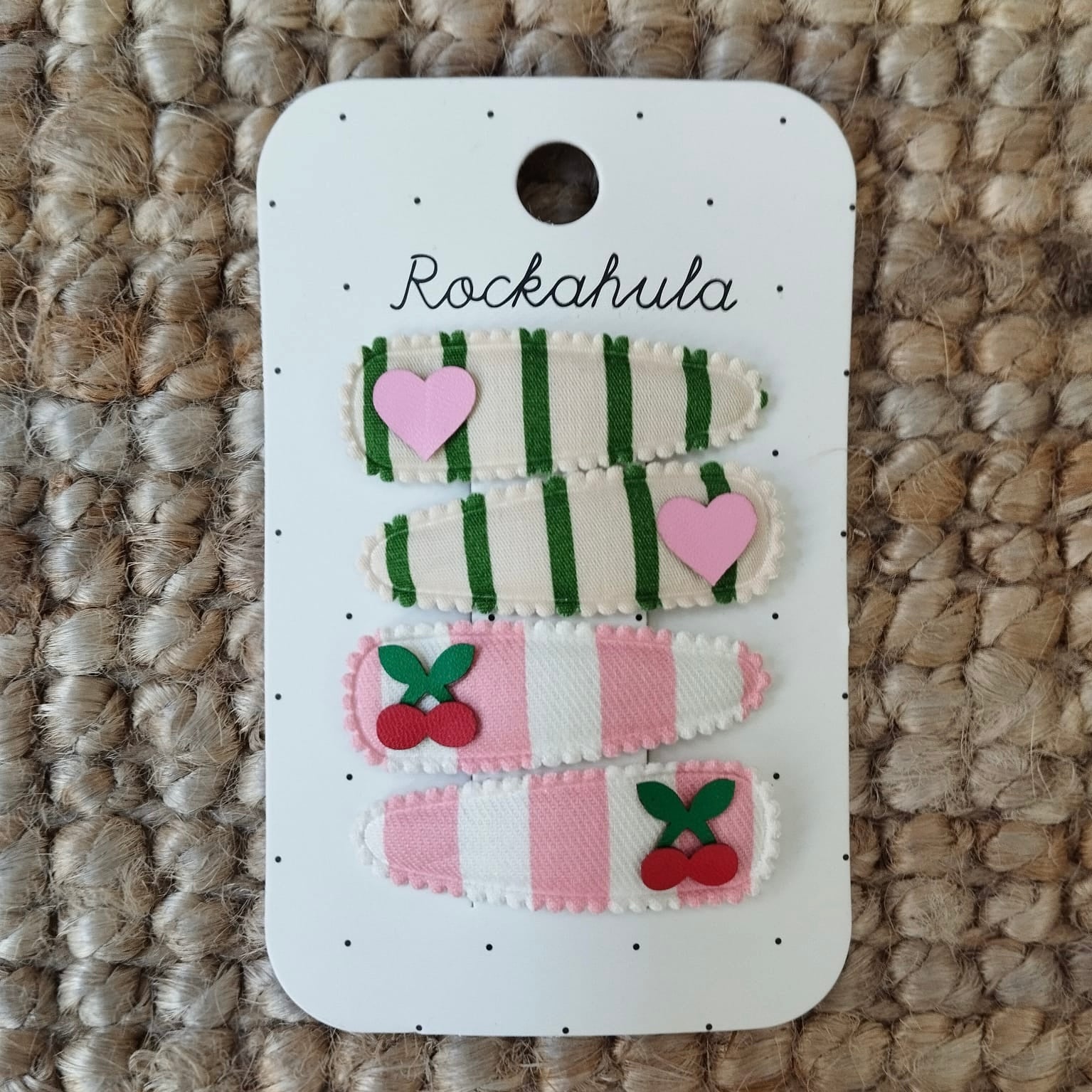 Pack di quattro adorabili mollettine clips con ciliegie e cuoricini su base fantasia righe per la tua bambina!