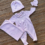 Tutina manica lunga con piedino, cappellino, guantini e copertina