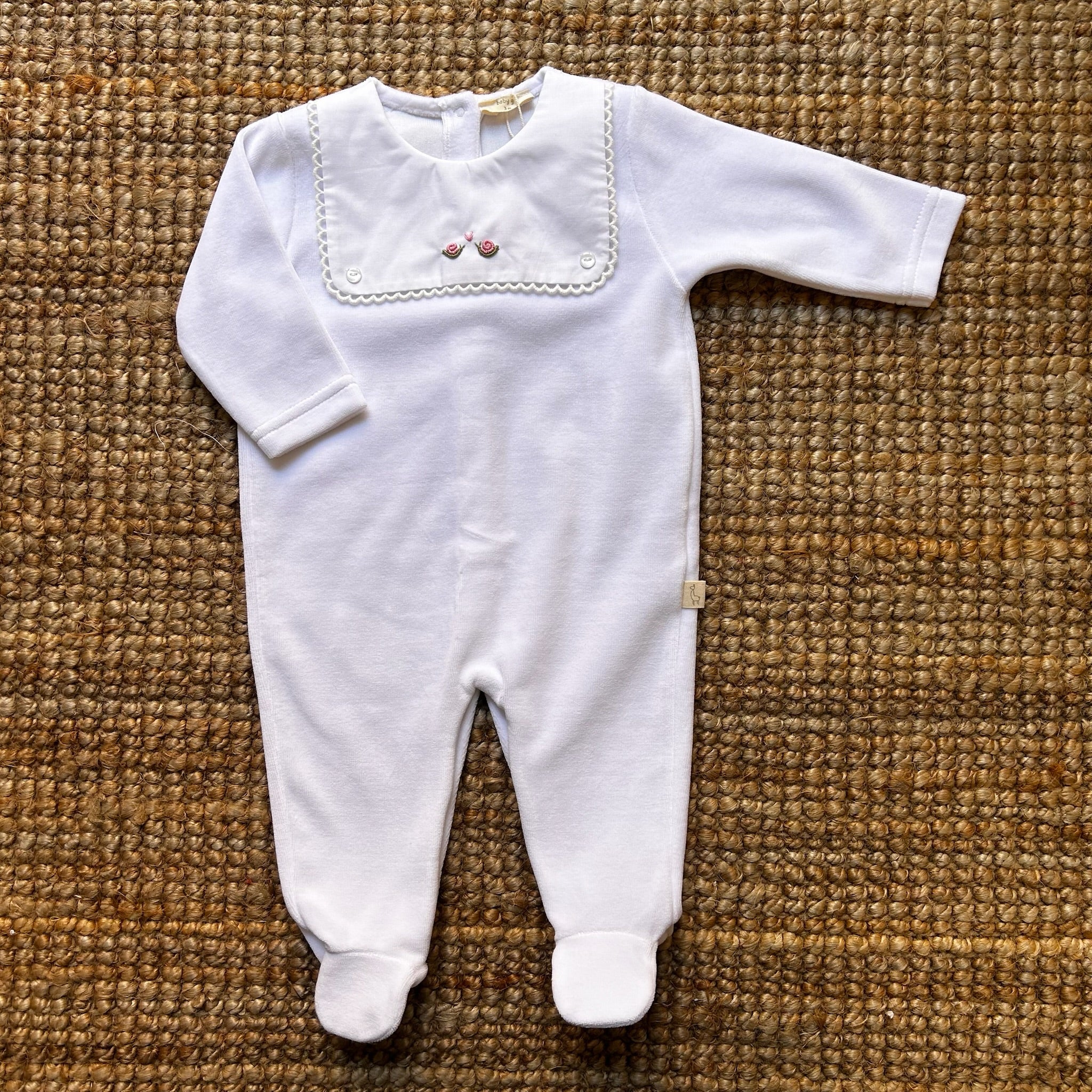 Tutina in ciniglia bianco con lumachine ricamate a mano BG543