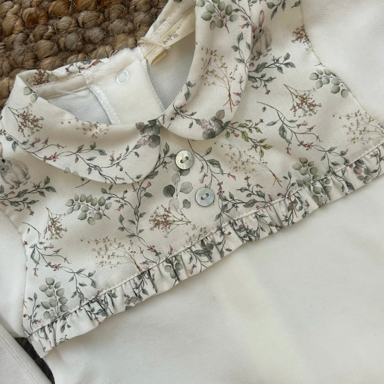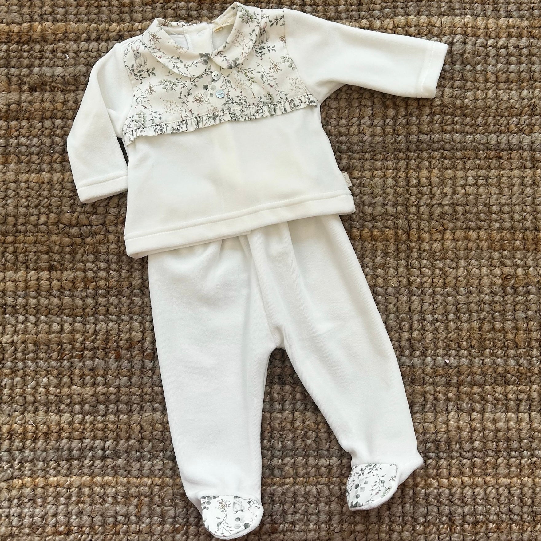 Tutina spezzata in ciniglia latte con rifiniture fiorellini SY55G