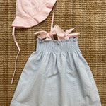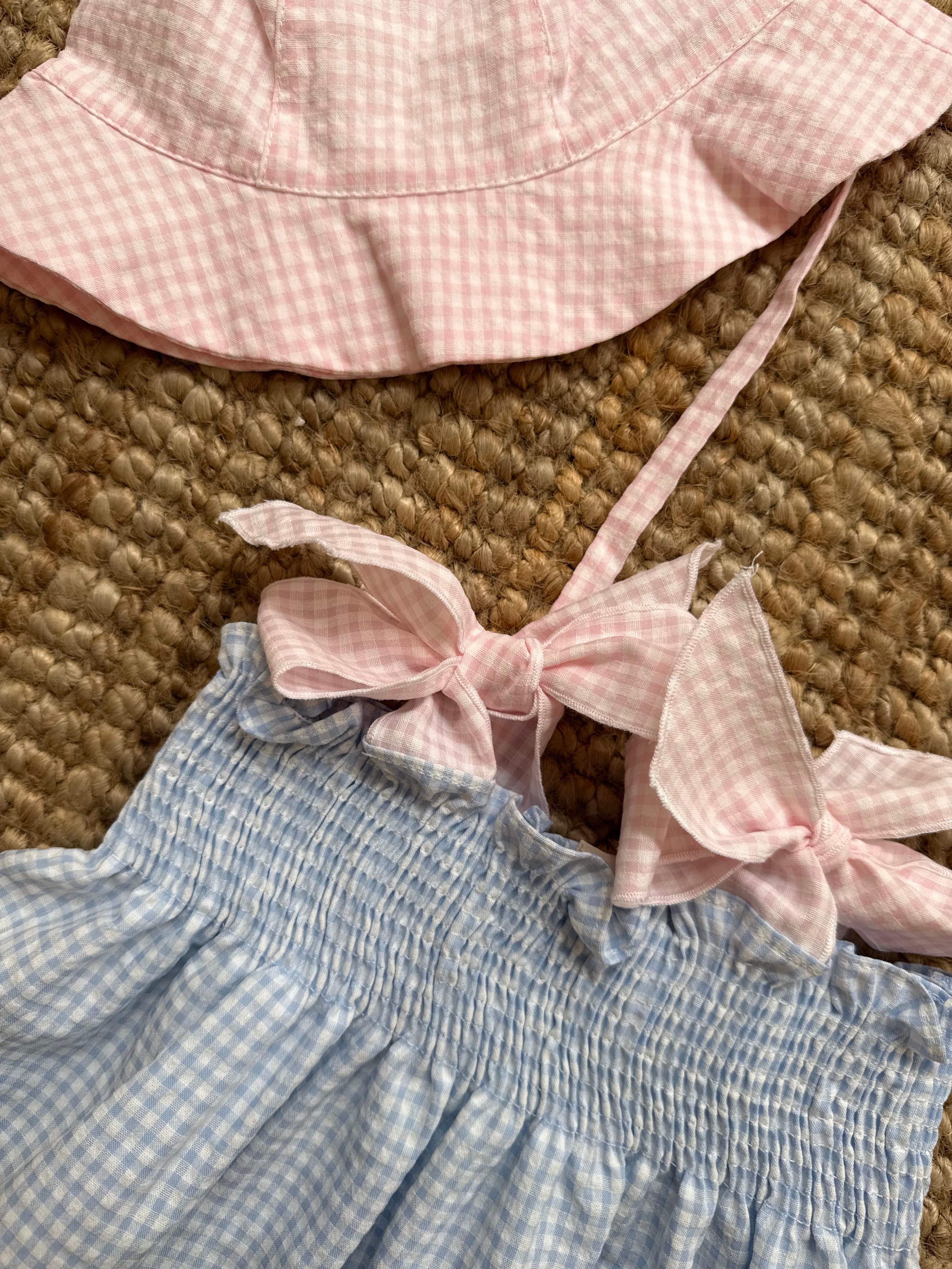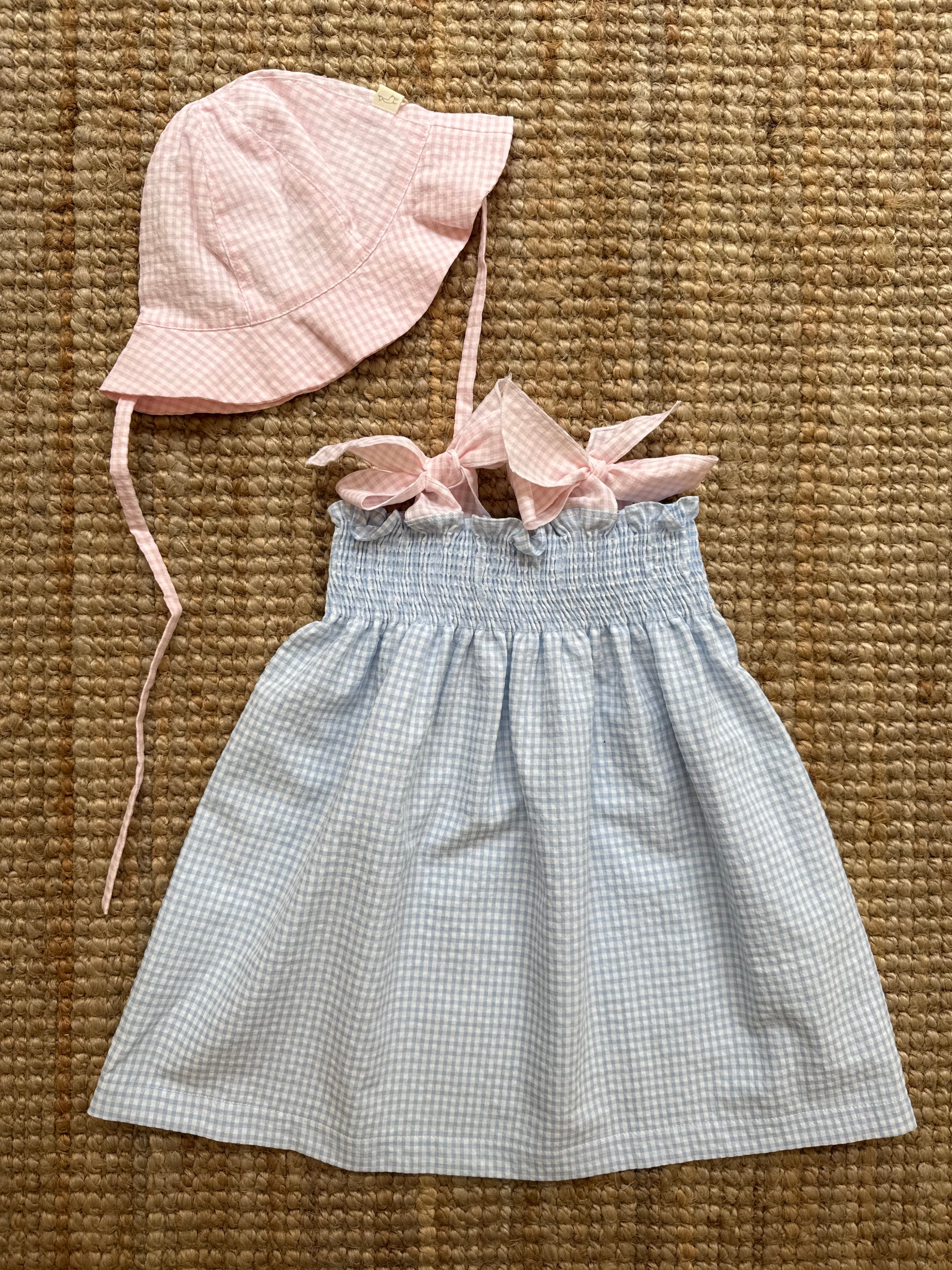 Abito vichy goffrato bianco e azzurro con fiocchi sulle spalle vichy bianco e rosa