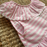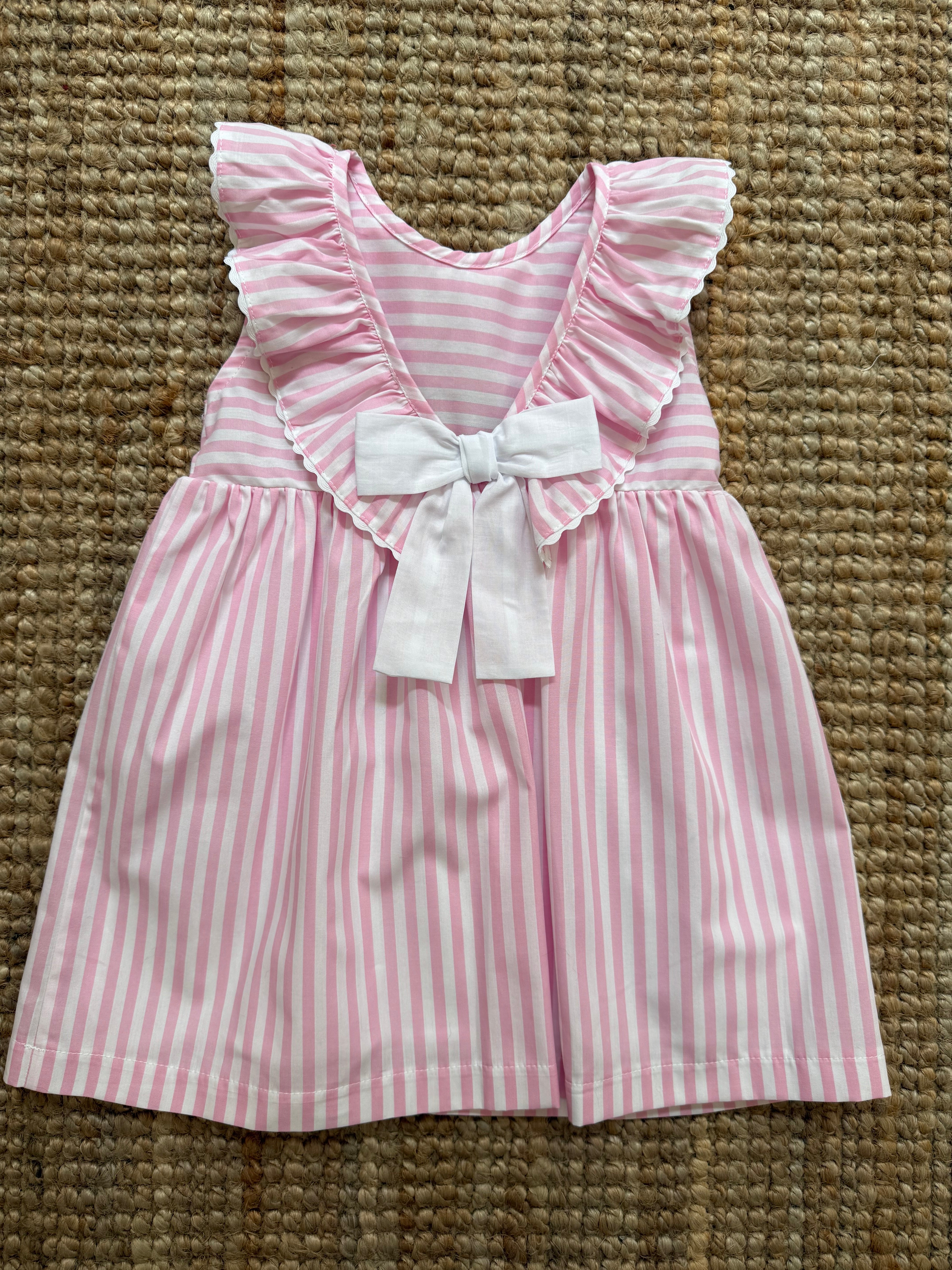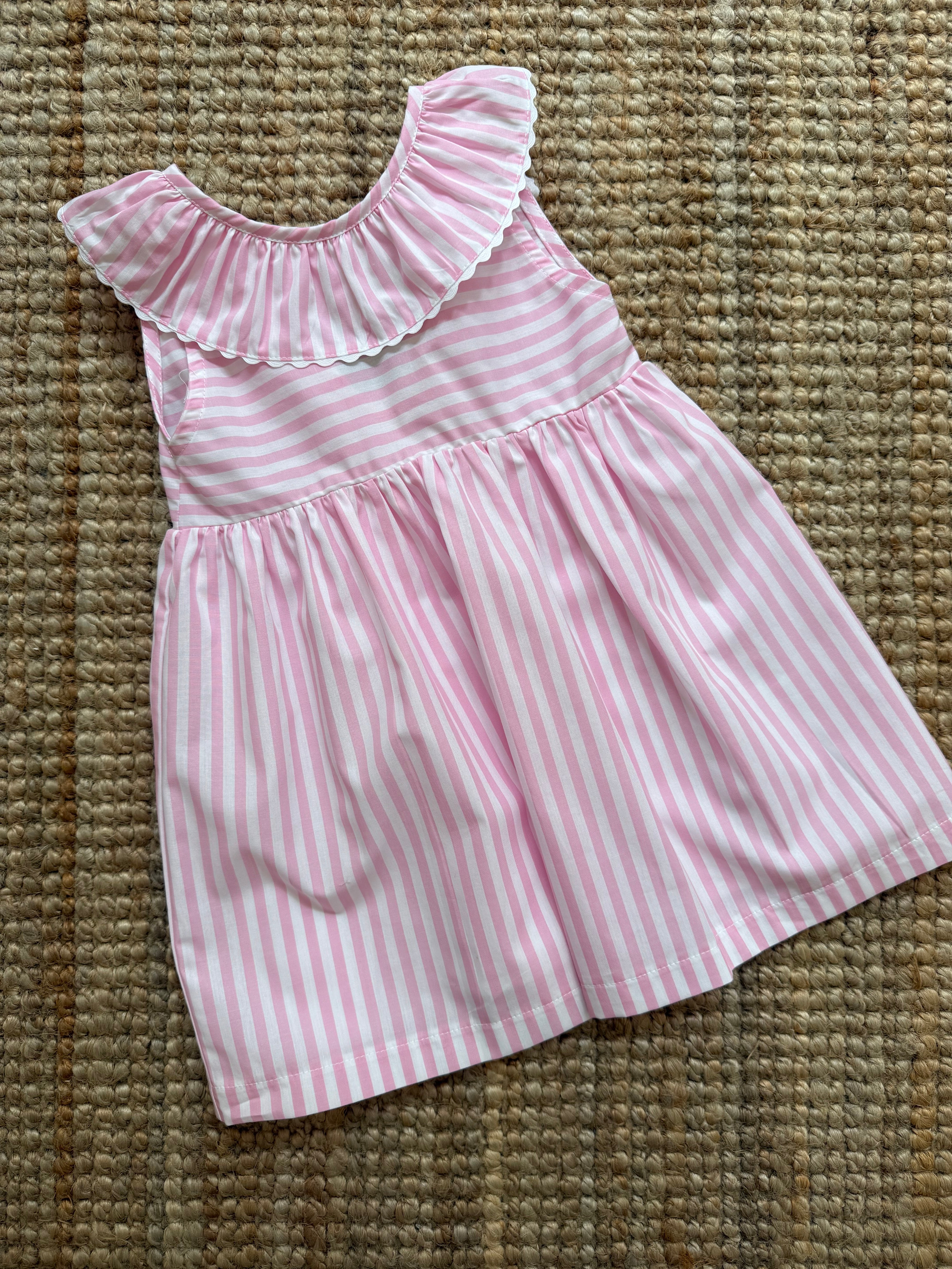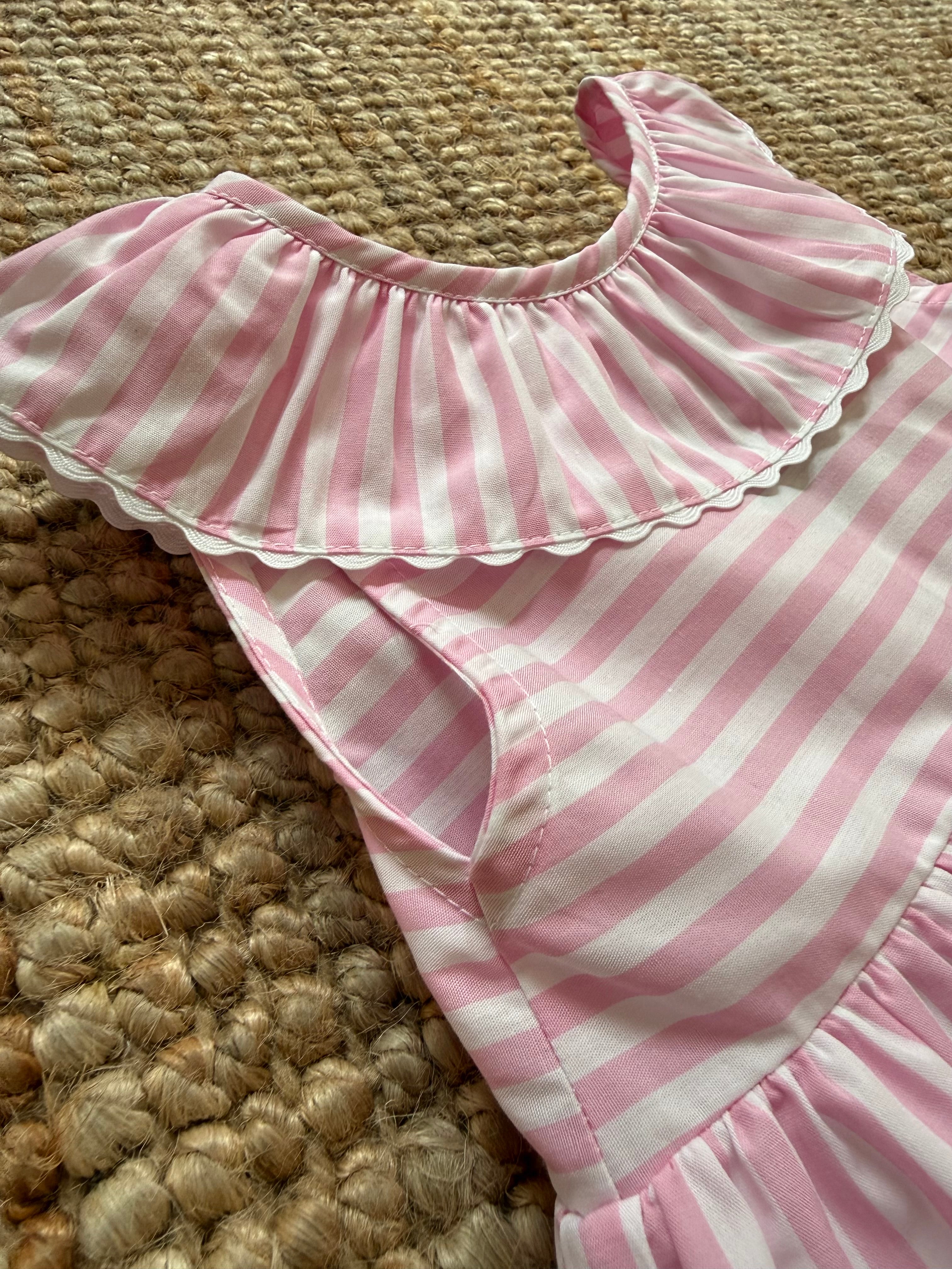 Abito righe bianco e rosa collo frill rifinito con serpentina