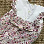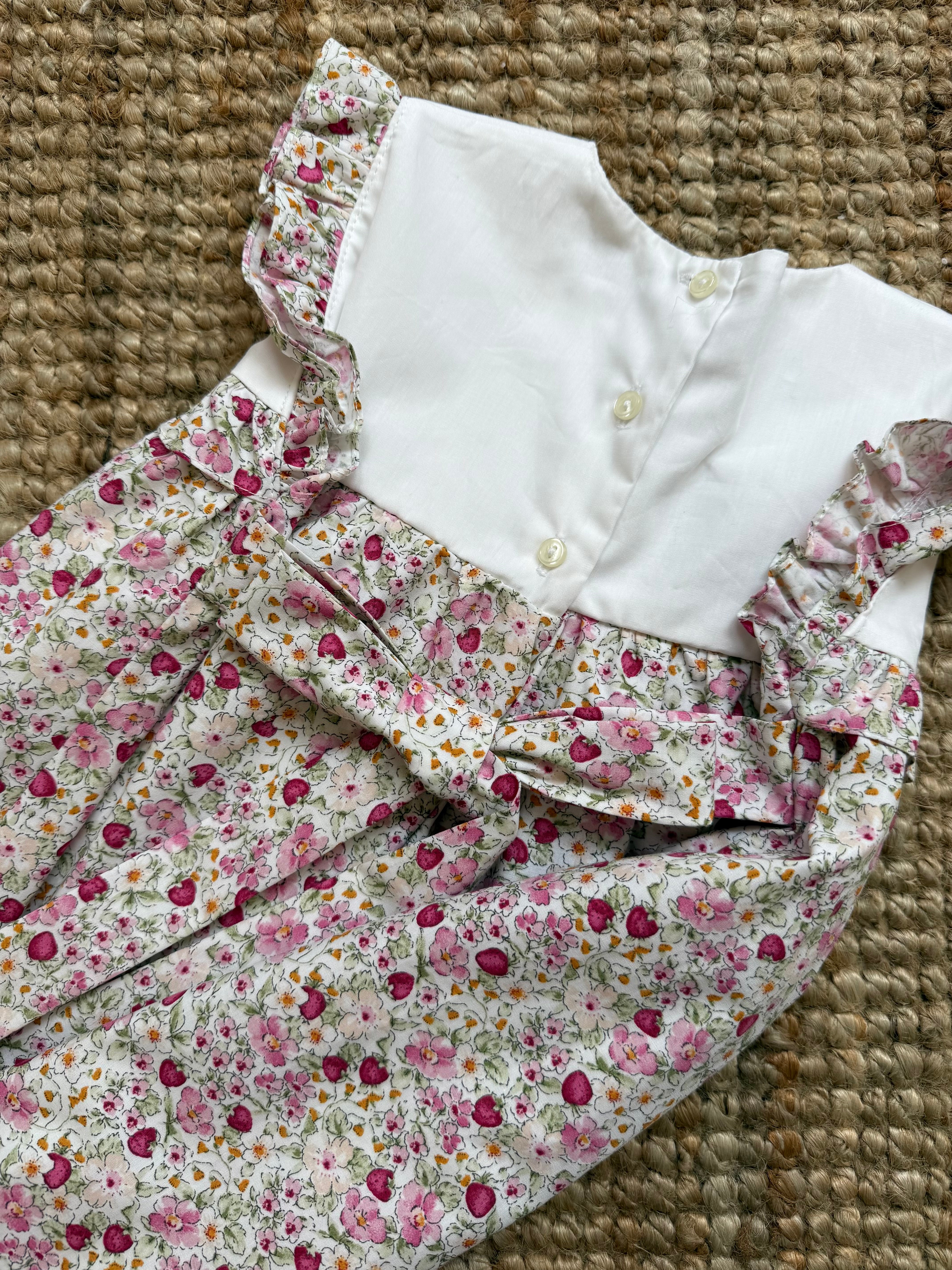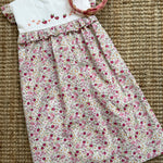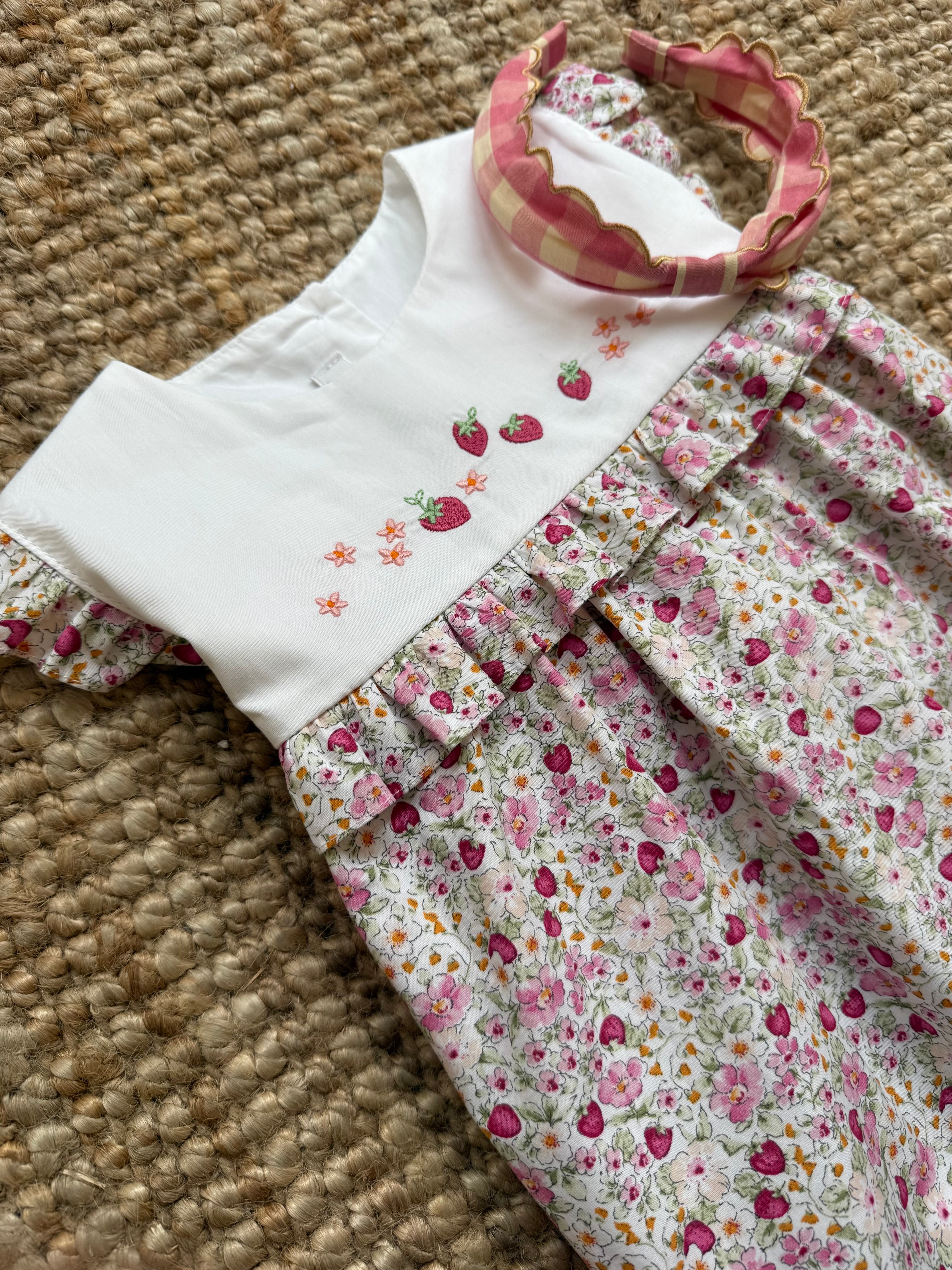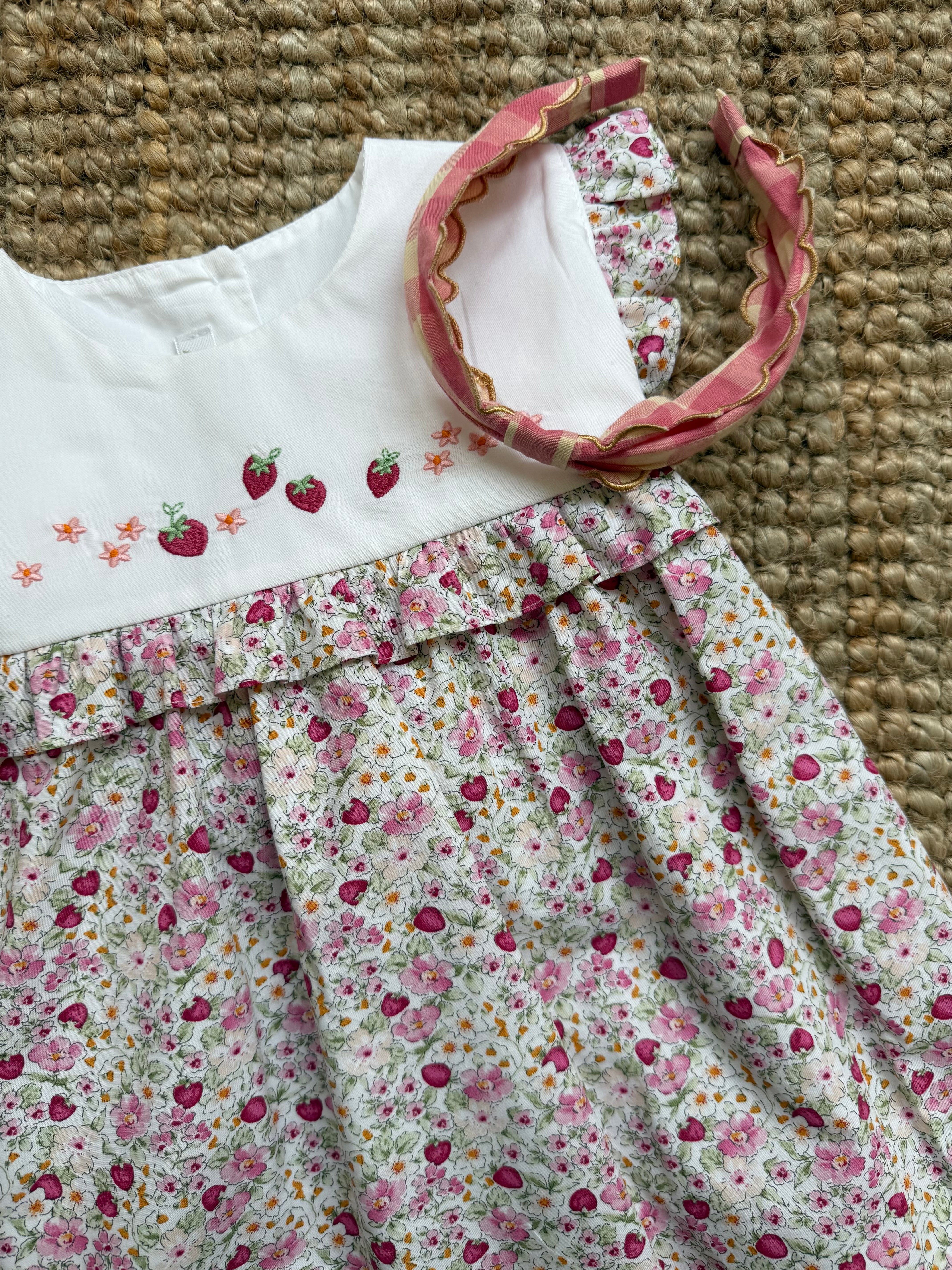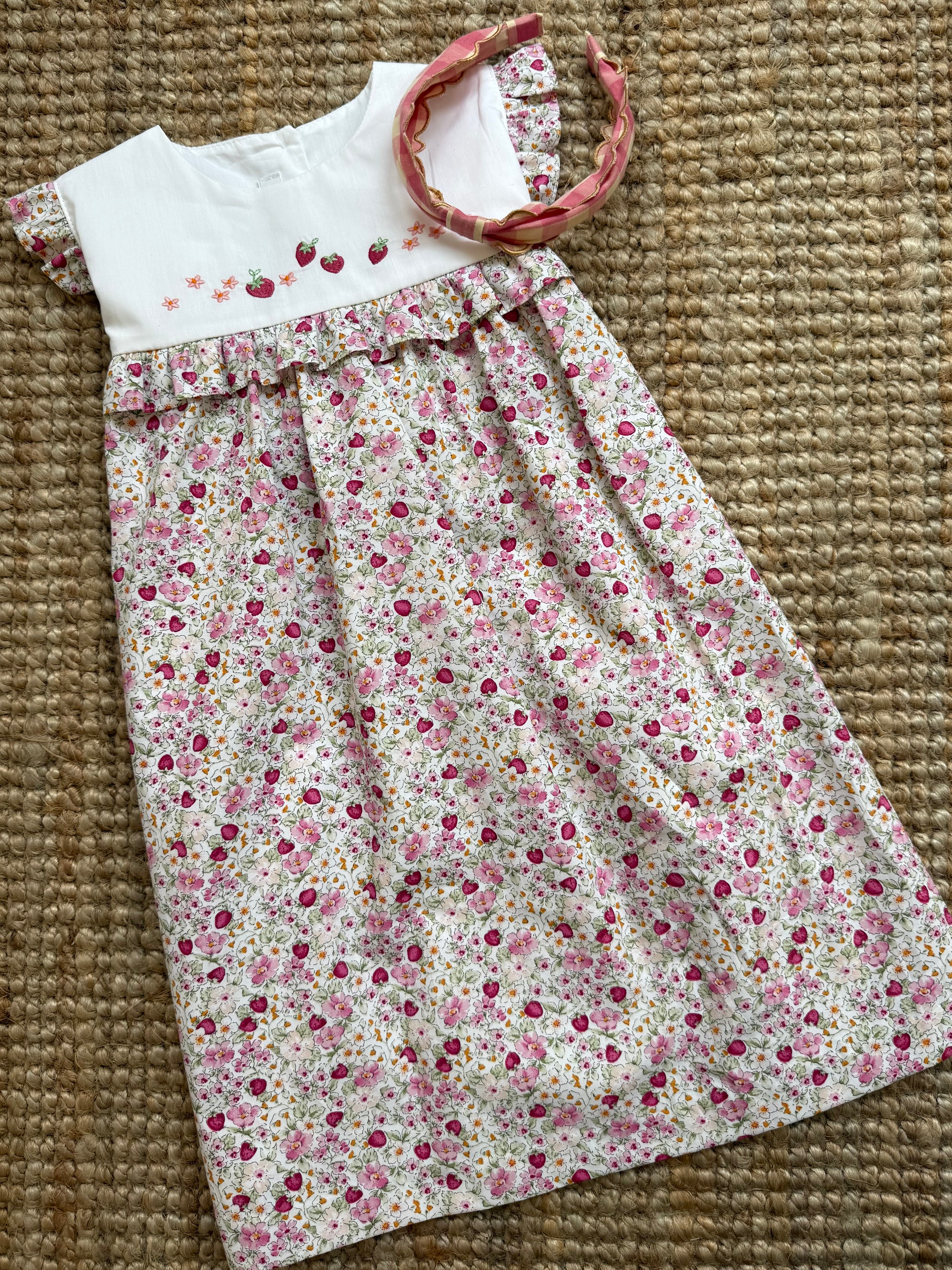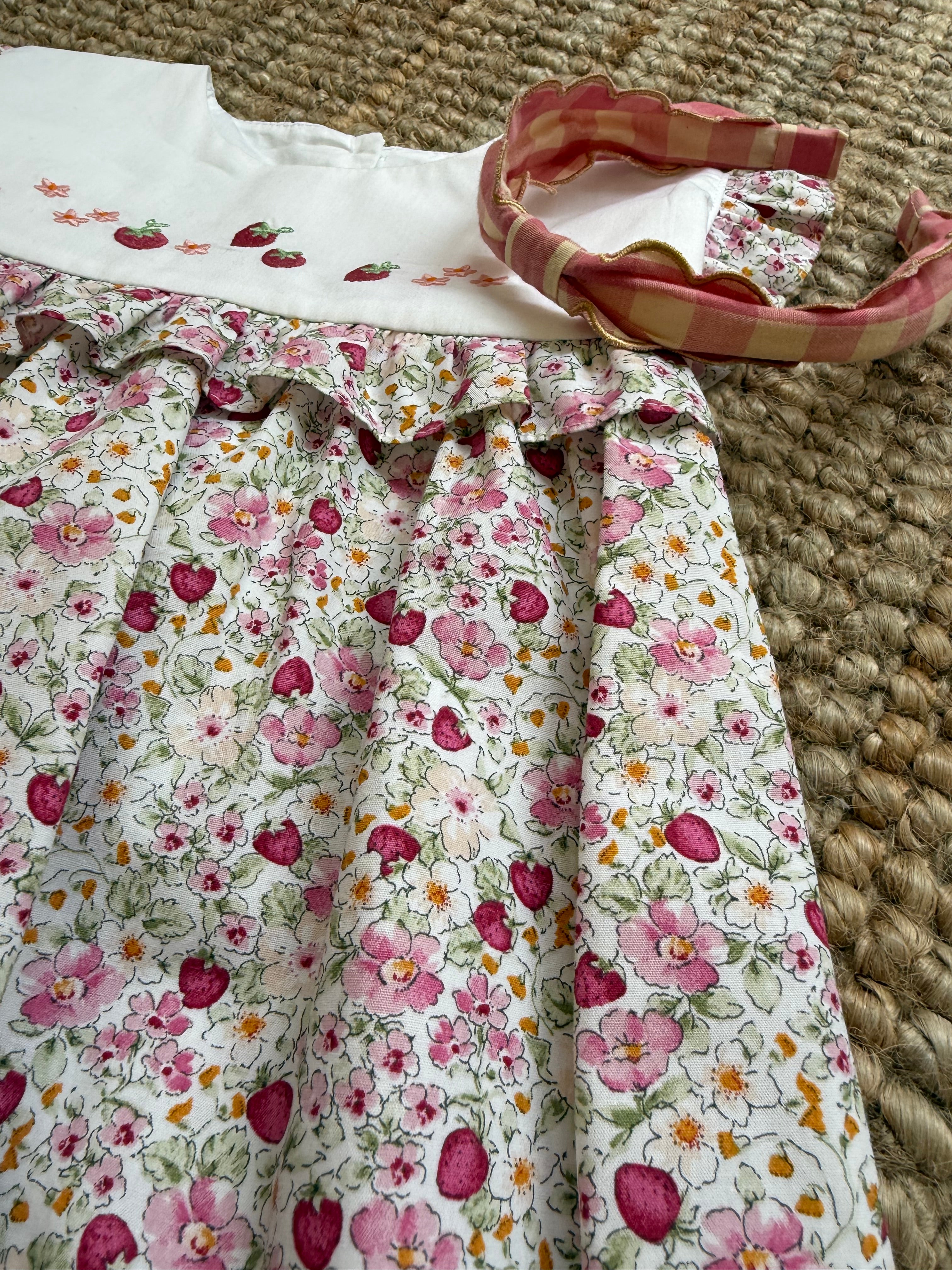 Abito con fragole ricamate sul corpetto, frill e gonna fantasia