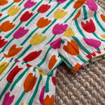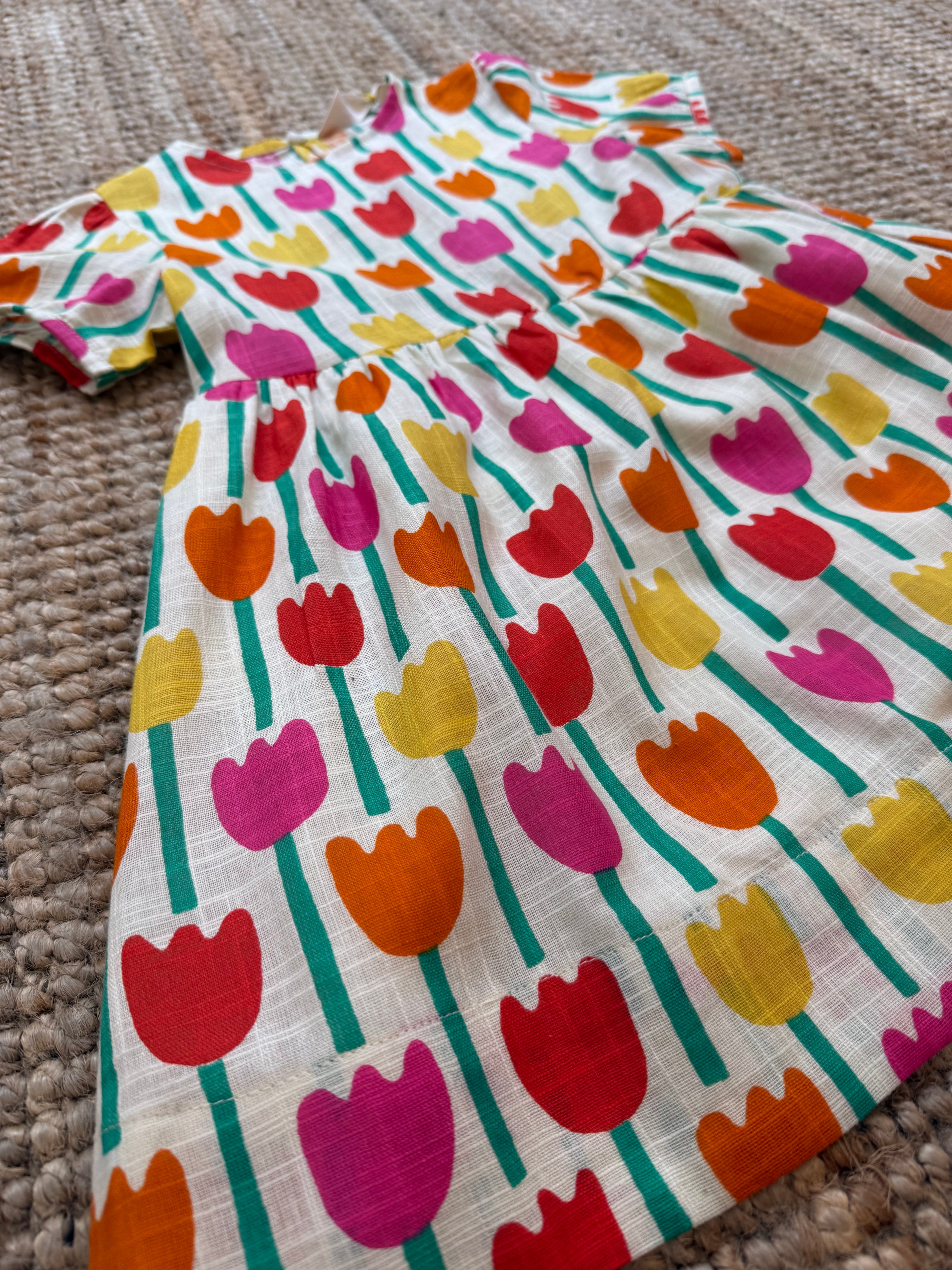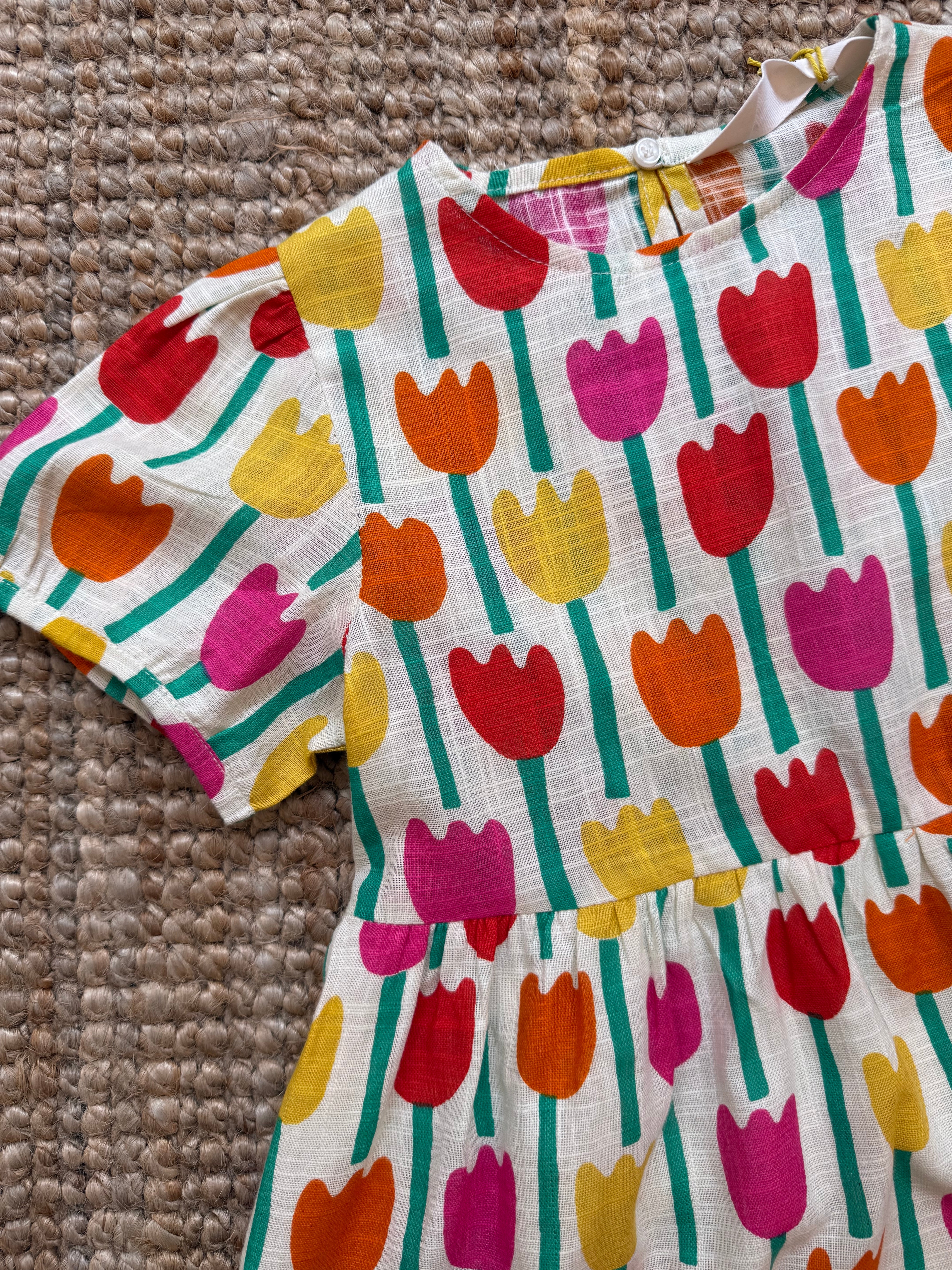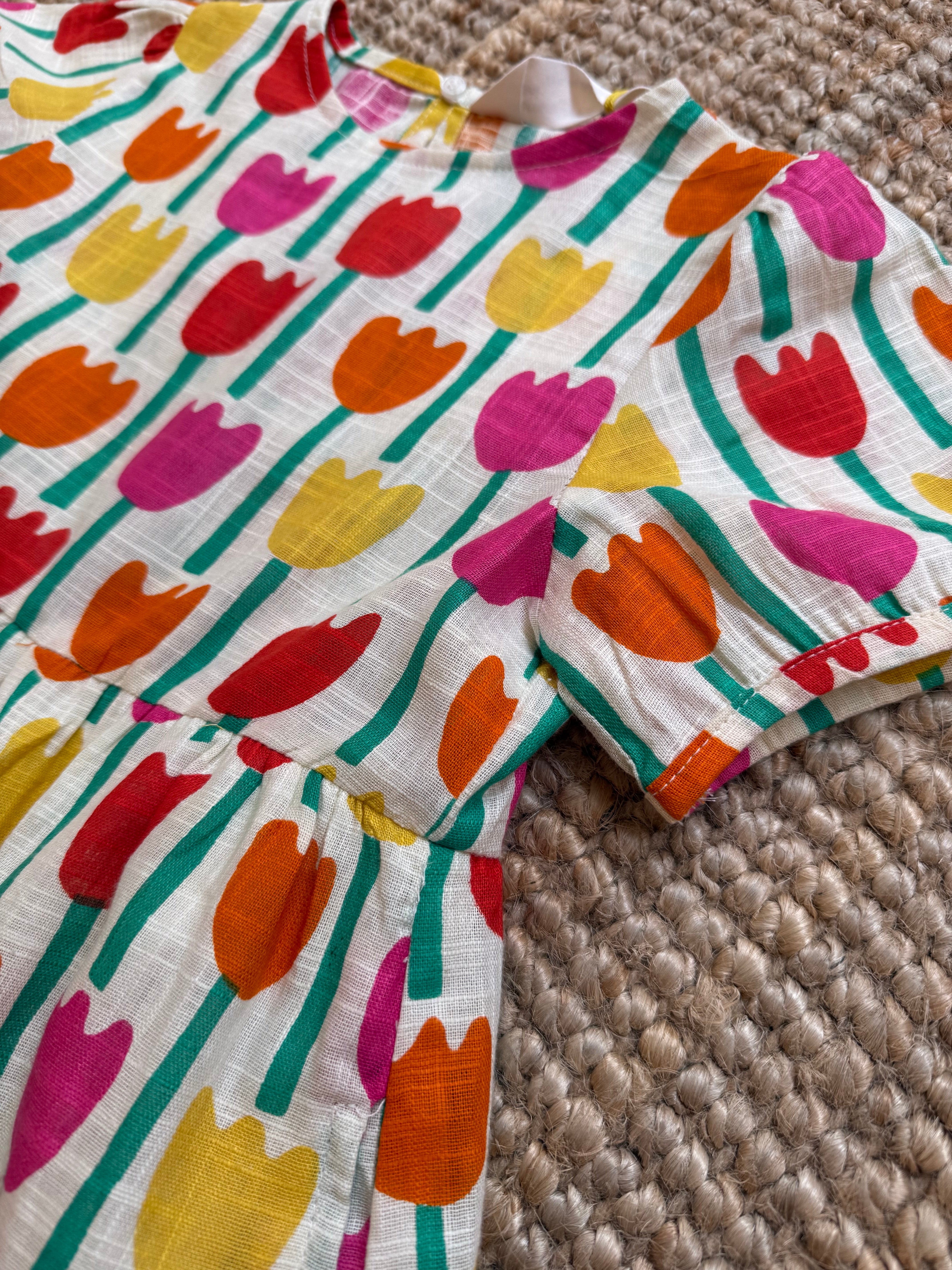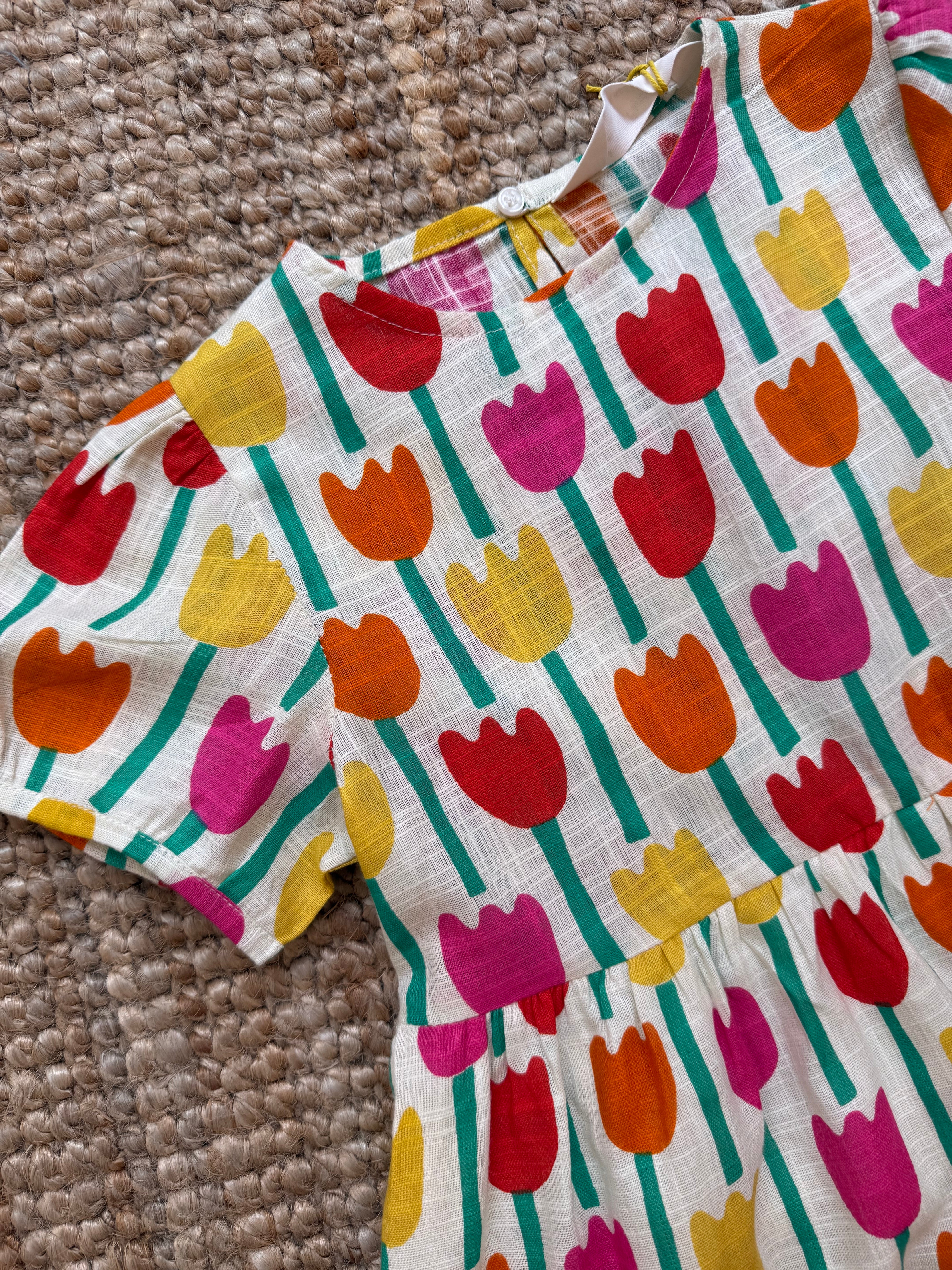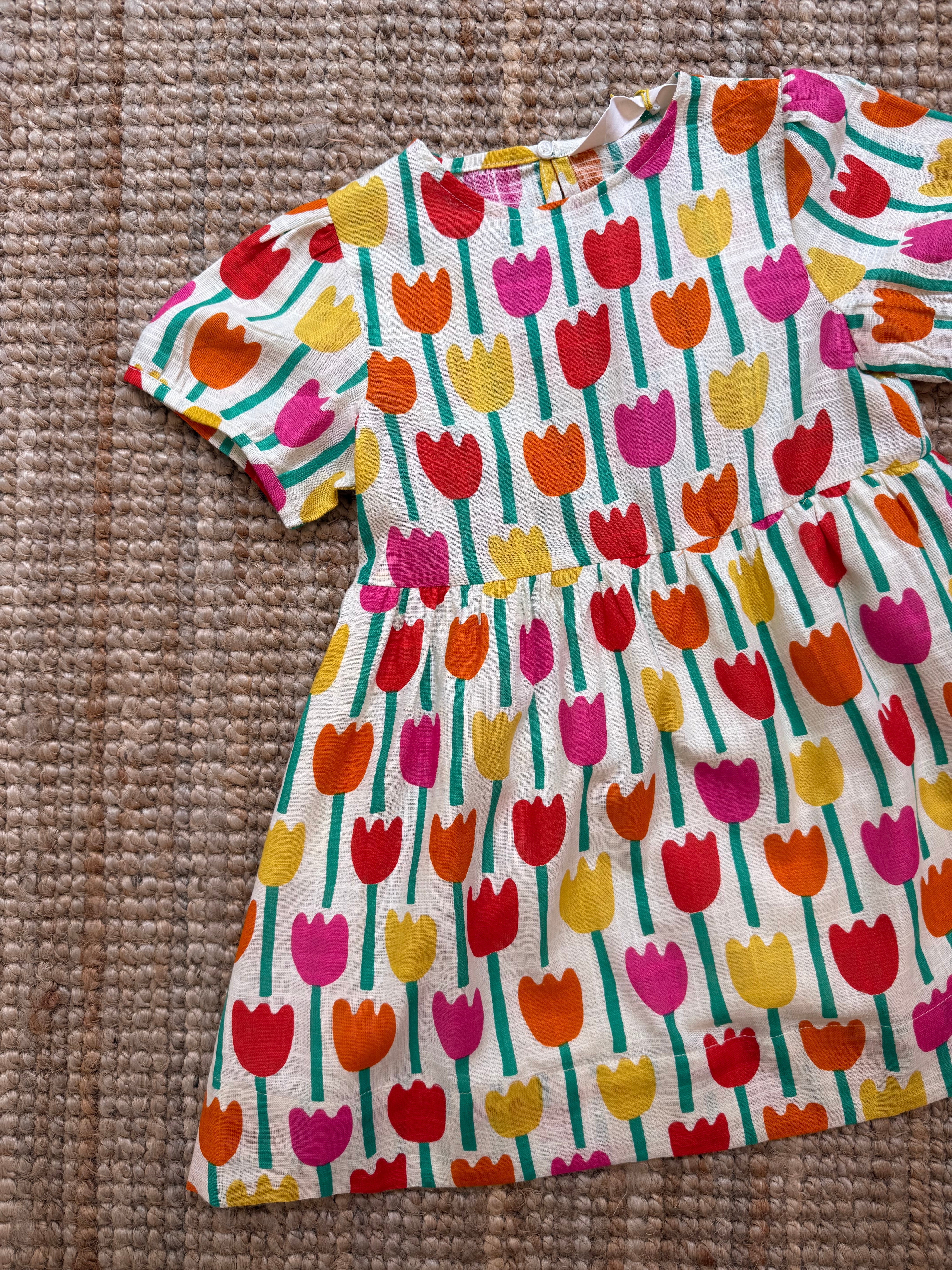 Abito fantasia tulipani a mezza manica con fodera interna e bottoncino sul retro