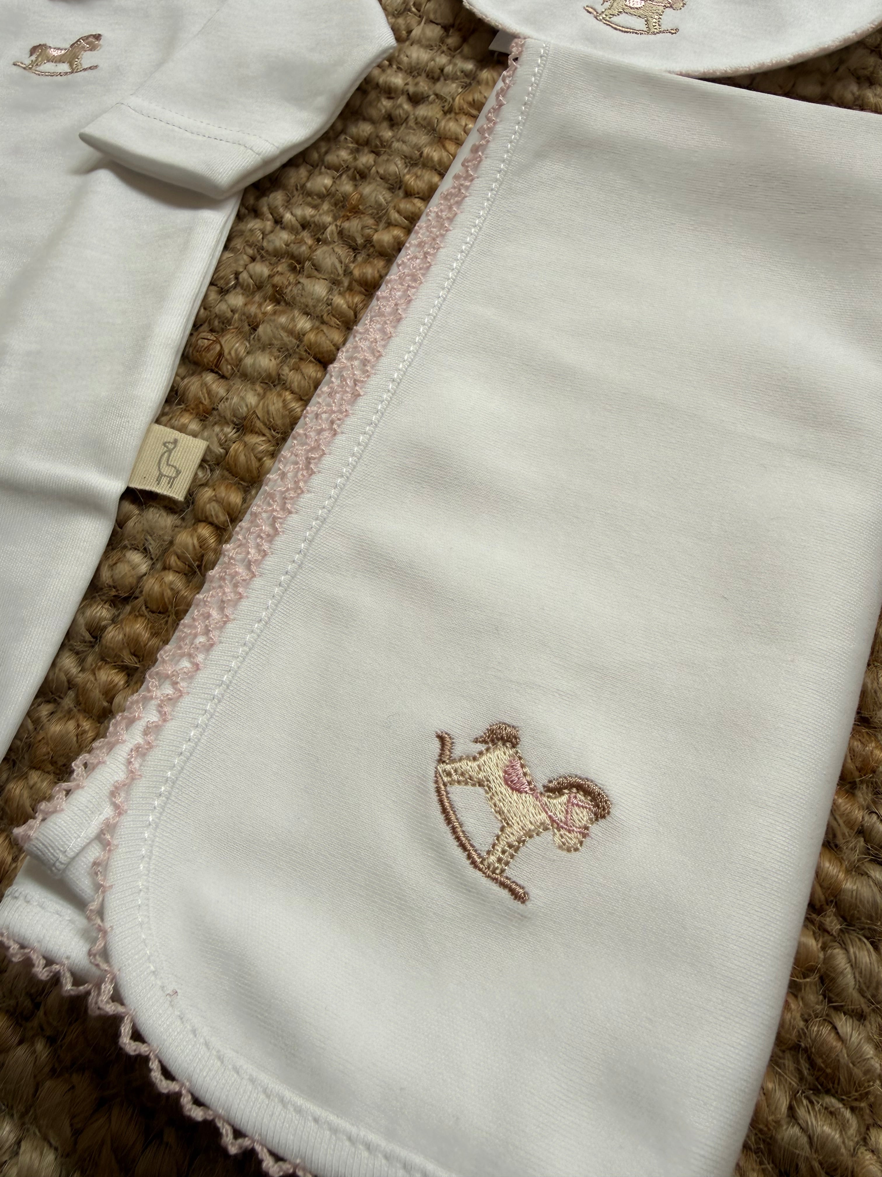 Copertina quadrata bianco cavallino a dondolo ricamato rosa RH10 Baby Gi