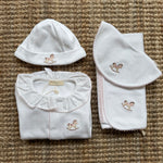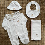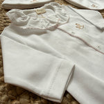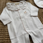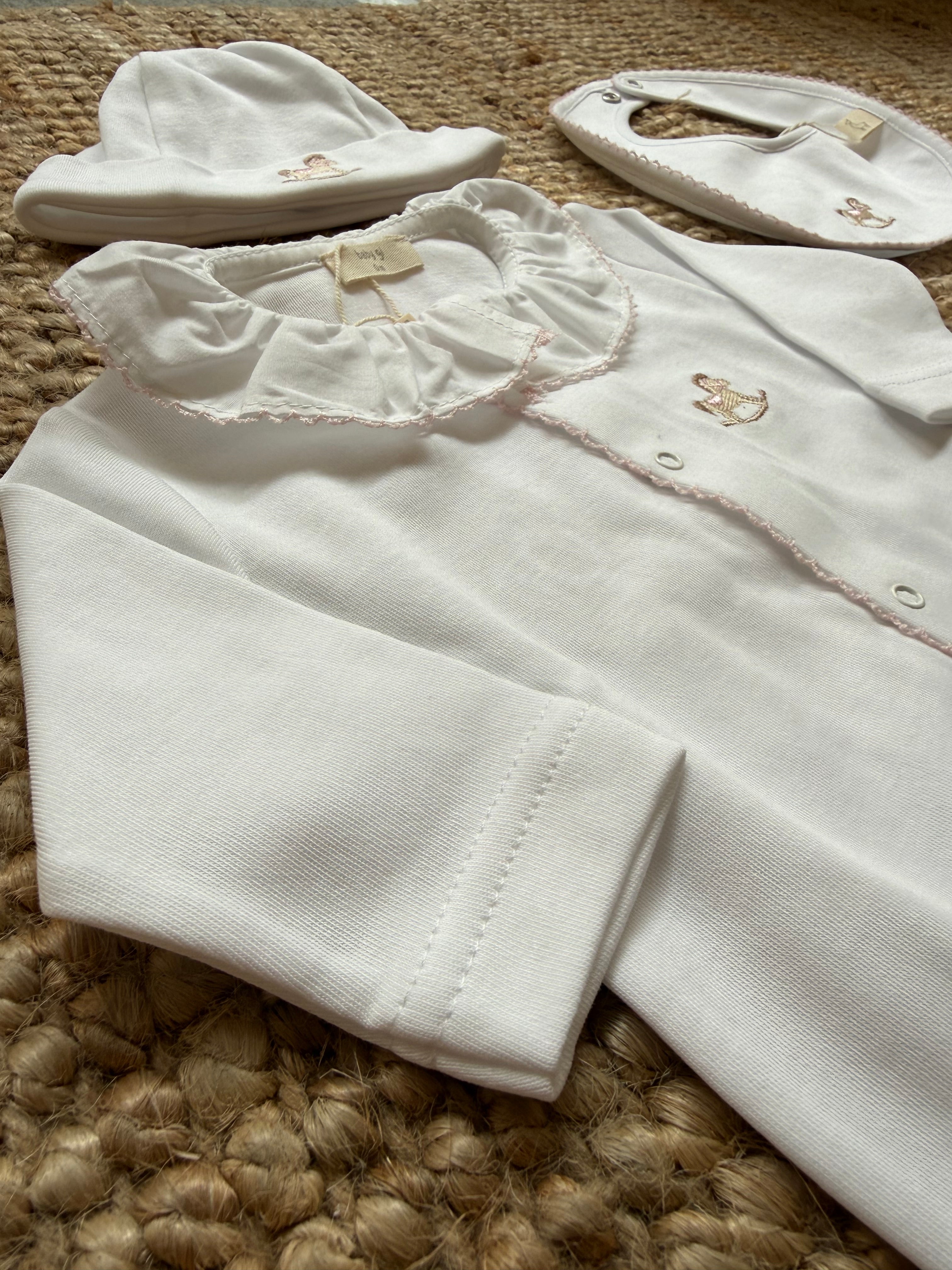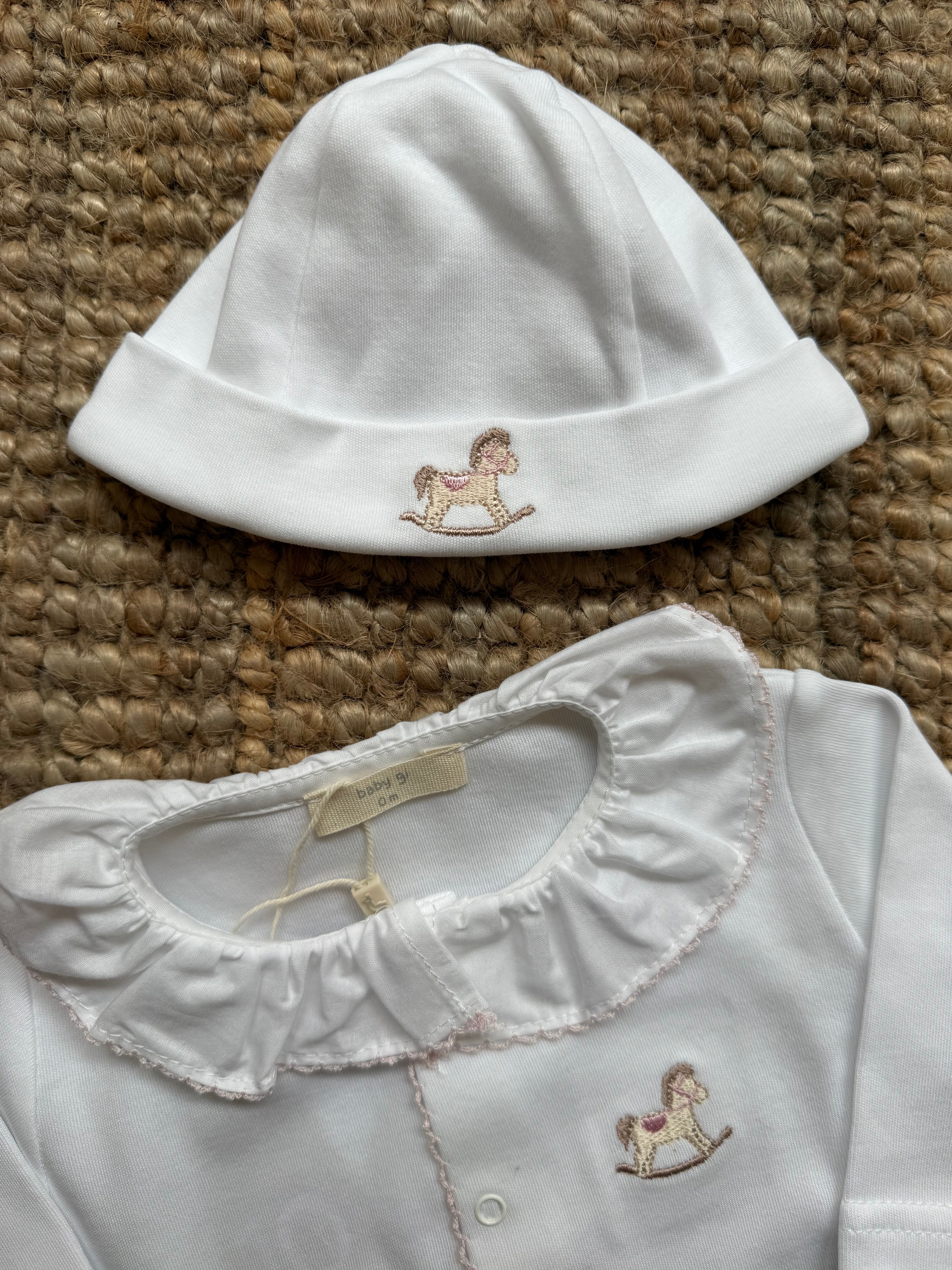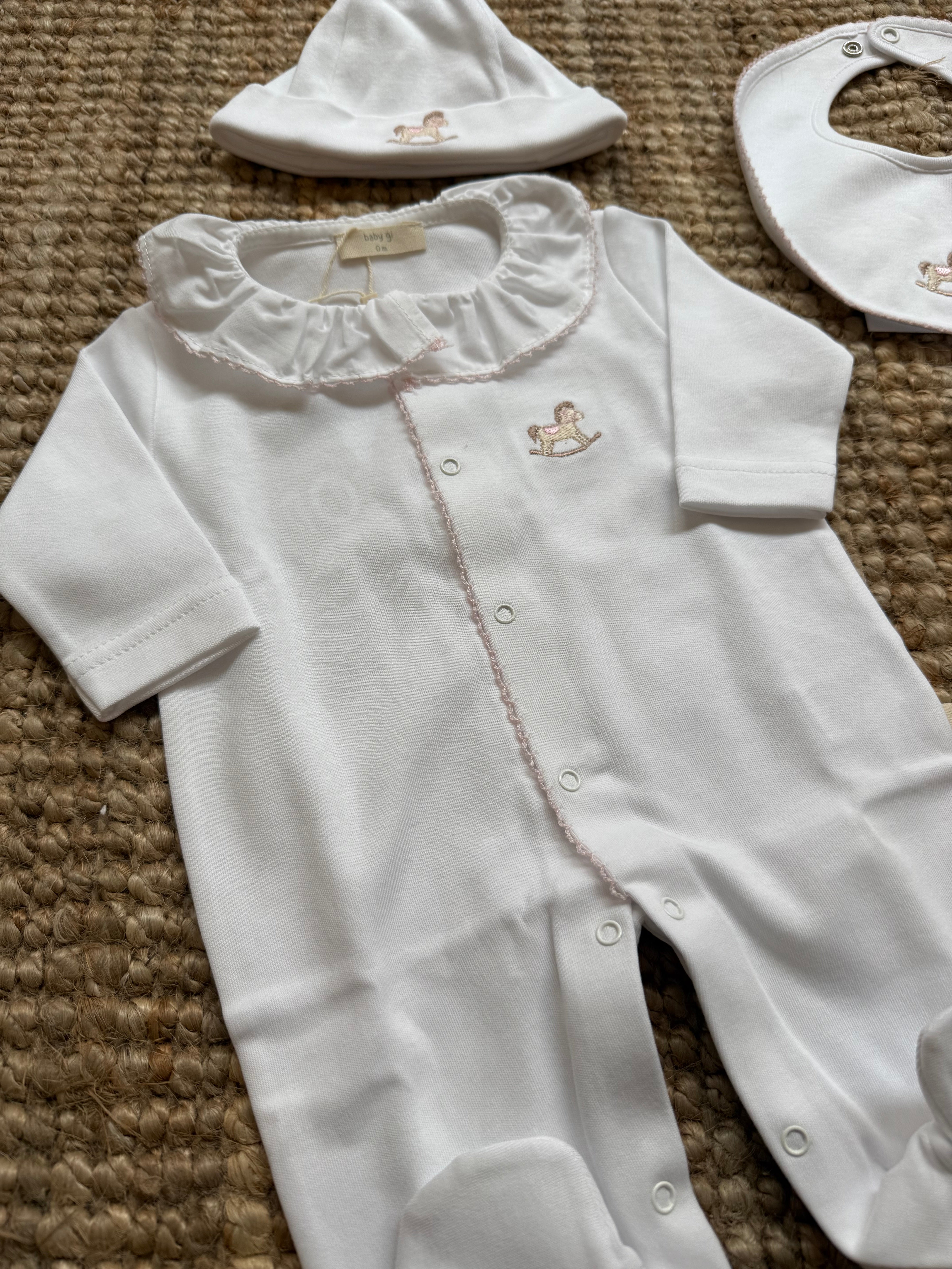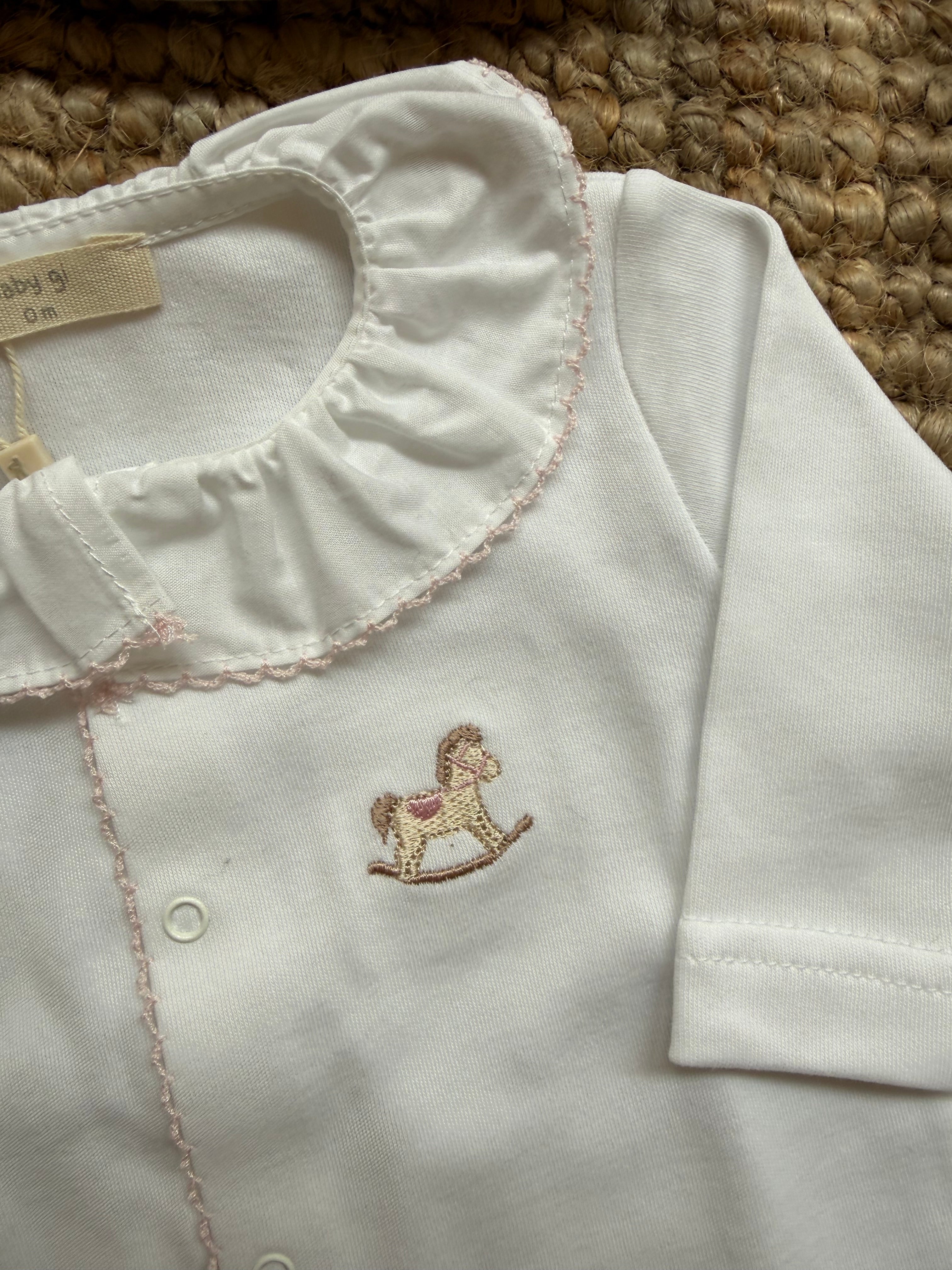 Tutina con cavallino a dondolo ricamato a manica lunga, con piedini e colletto frill
