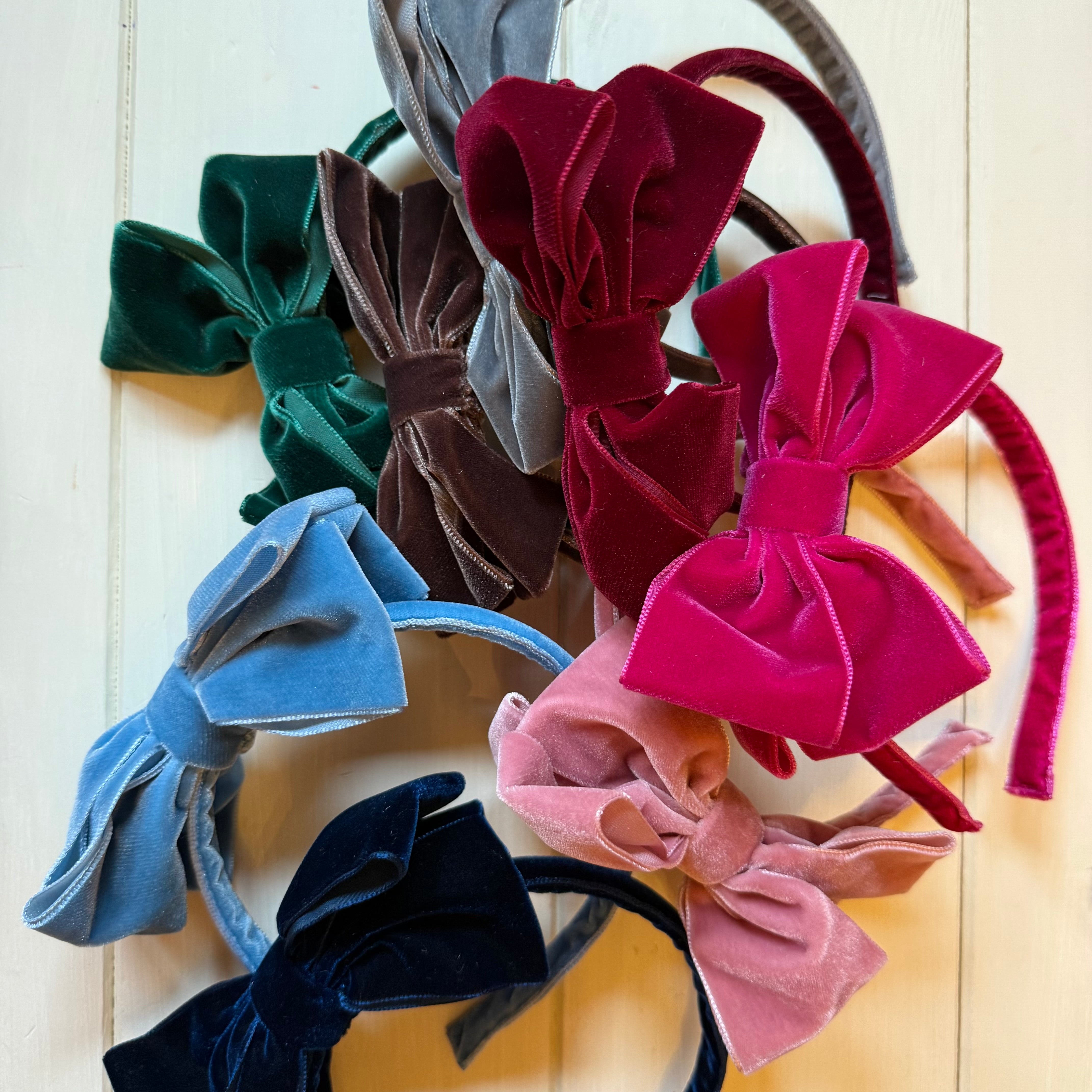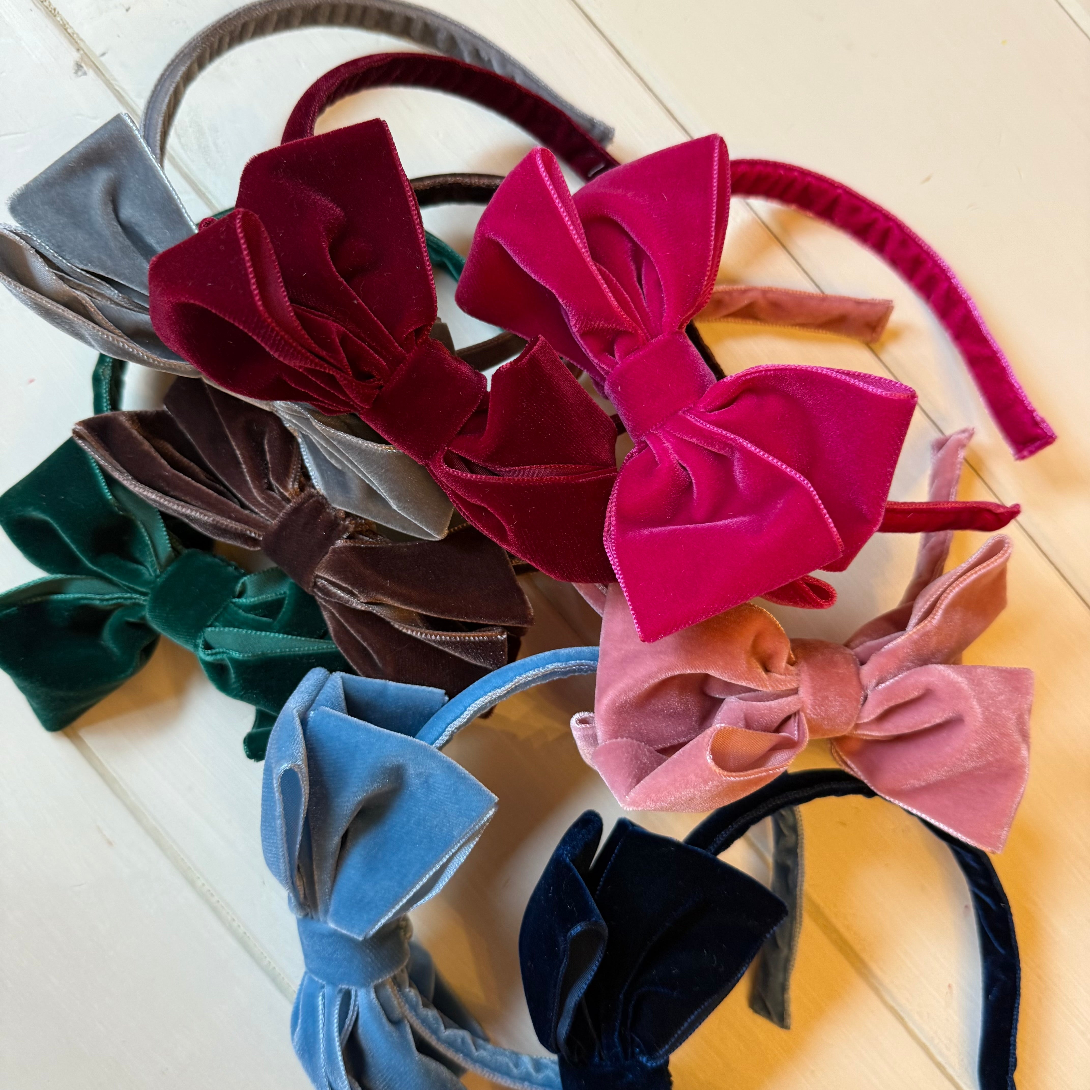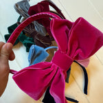 Cerchietto rivestito in velluto con maxi fiocco doppio, l'accessorio perfetto per rifinire il look della tua bambina con eleganza