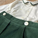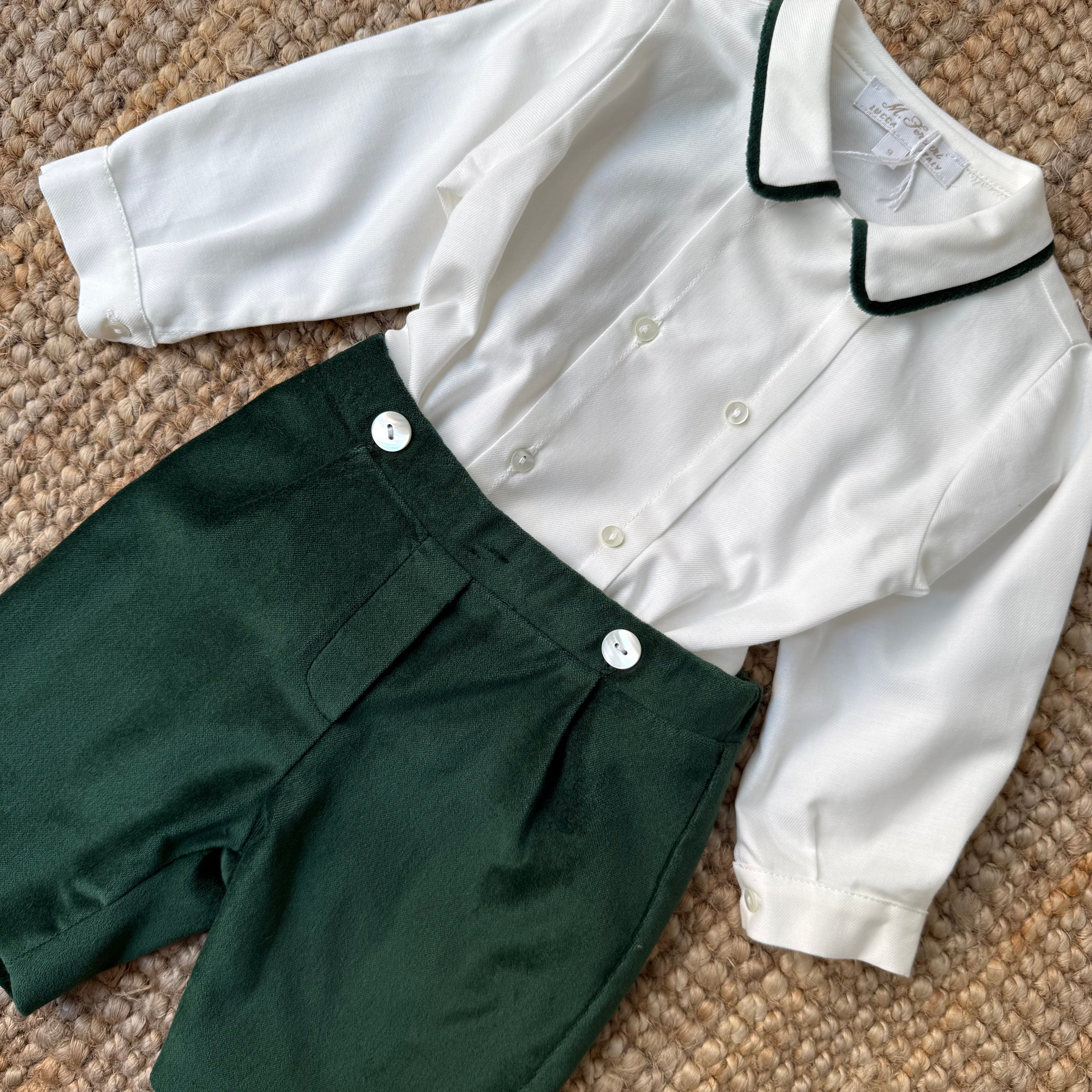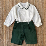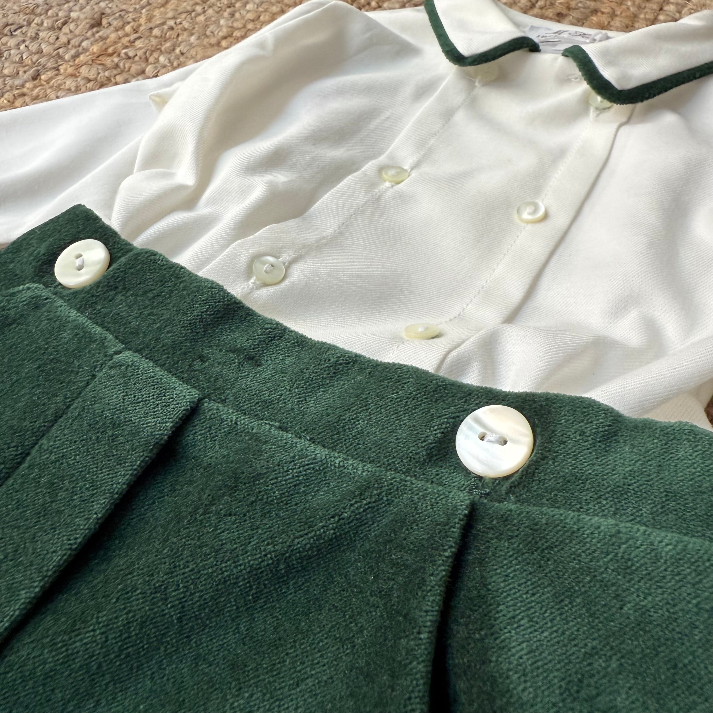 Eleganza senza tempo: pagliaccetto da cerimonia bicolore composto da parte superiore camicia doppio petto con colletto profilato unito a bermuda in velluto