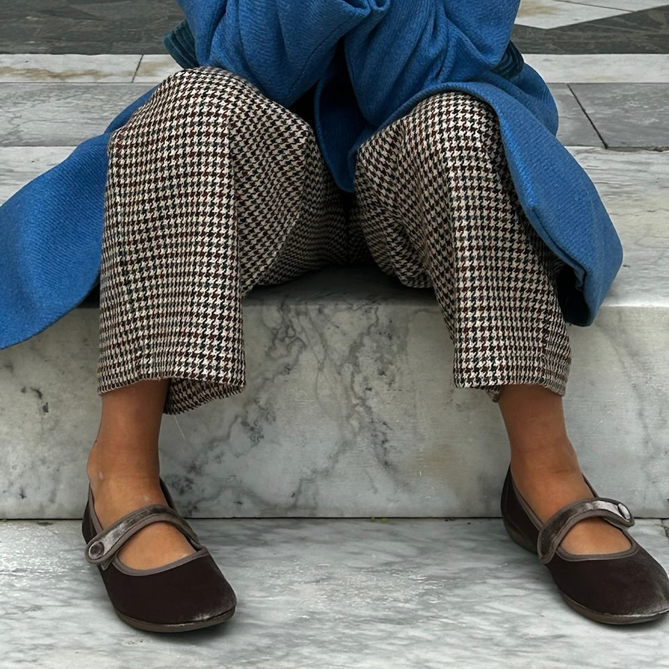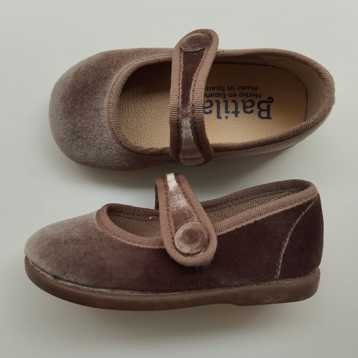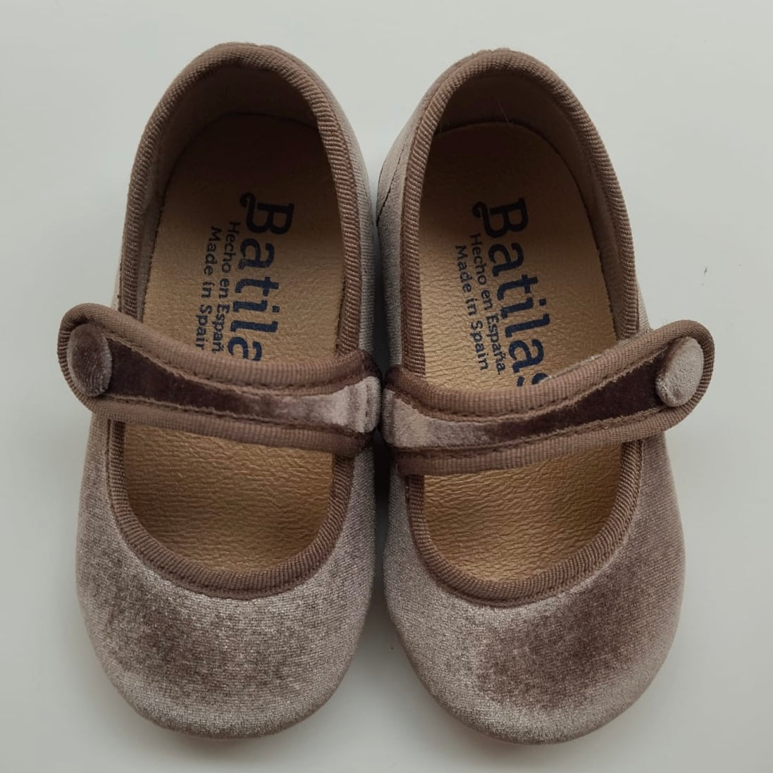 Modello in velluto con laccino che si chiude con strap rifinito con bottoncino rivestito e suola in gomma