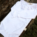 Manica lunga con piccola rouches, abbottonatura per cambio pannolino, bottoncini sul retro per indossarlo più facilmente