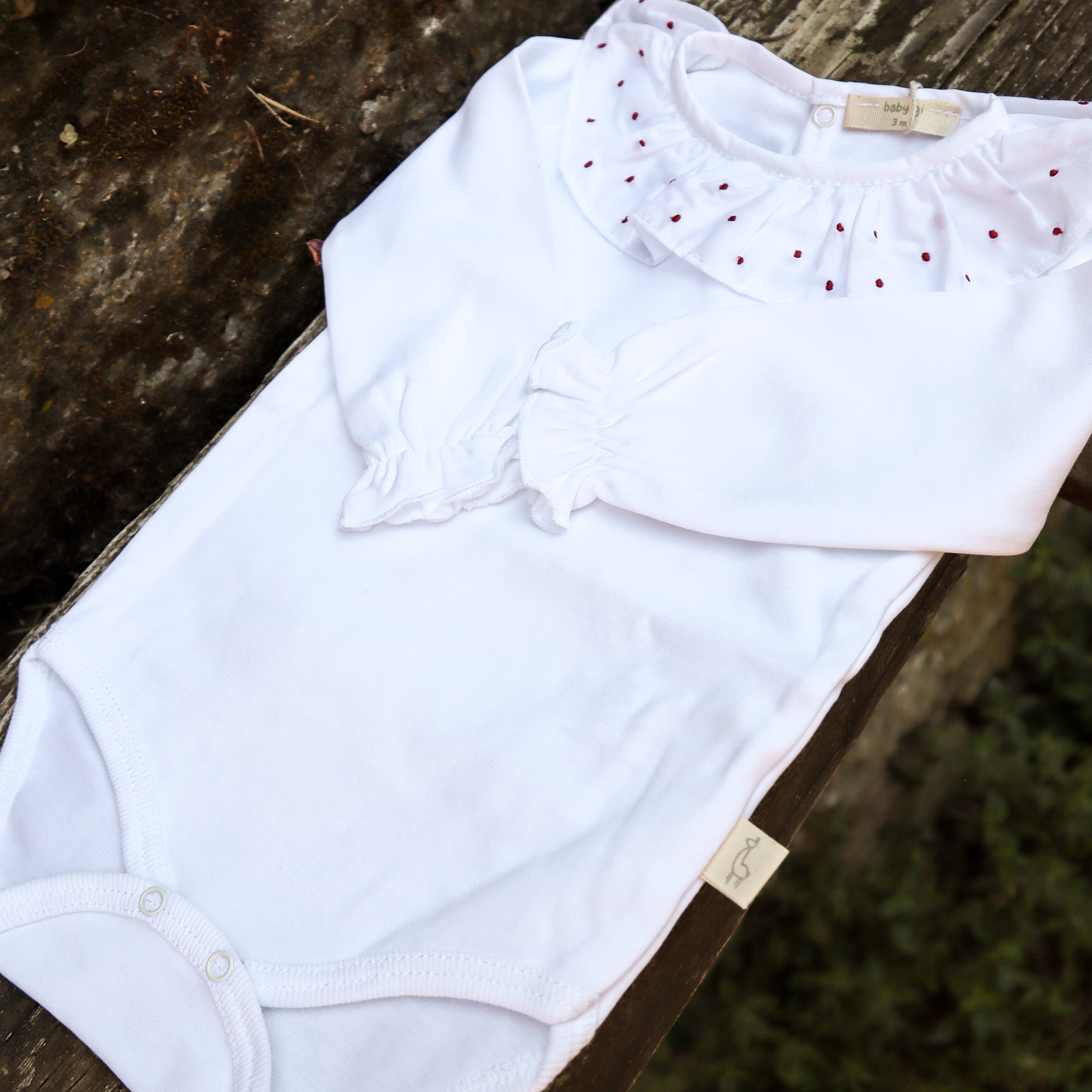 Body bianco con colletto ricamato pois bordeaux BG203G