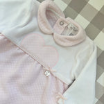 Tutina con parte superiore in ciniglia e parte inferiore impunturata, rifinita con cuore