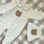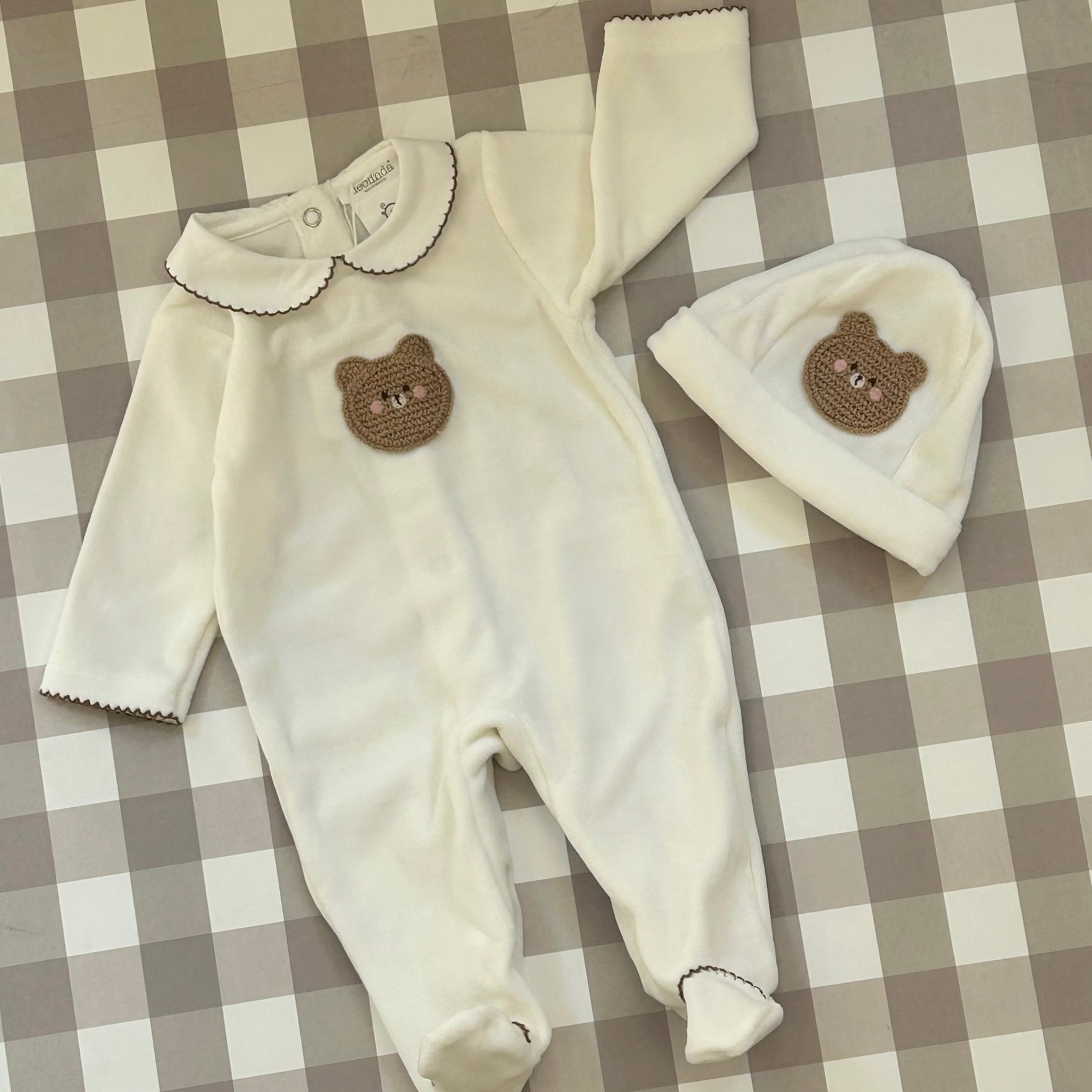 Manica lunga, con piedino, con abbottonatura sul retro e sul cavallo per cambio pannolino con bottoncini a pressione