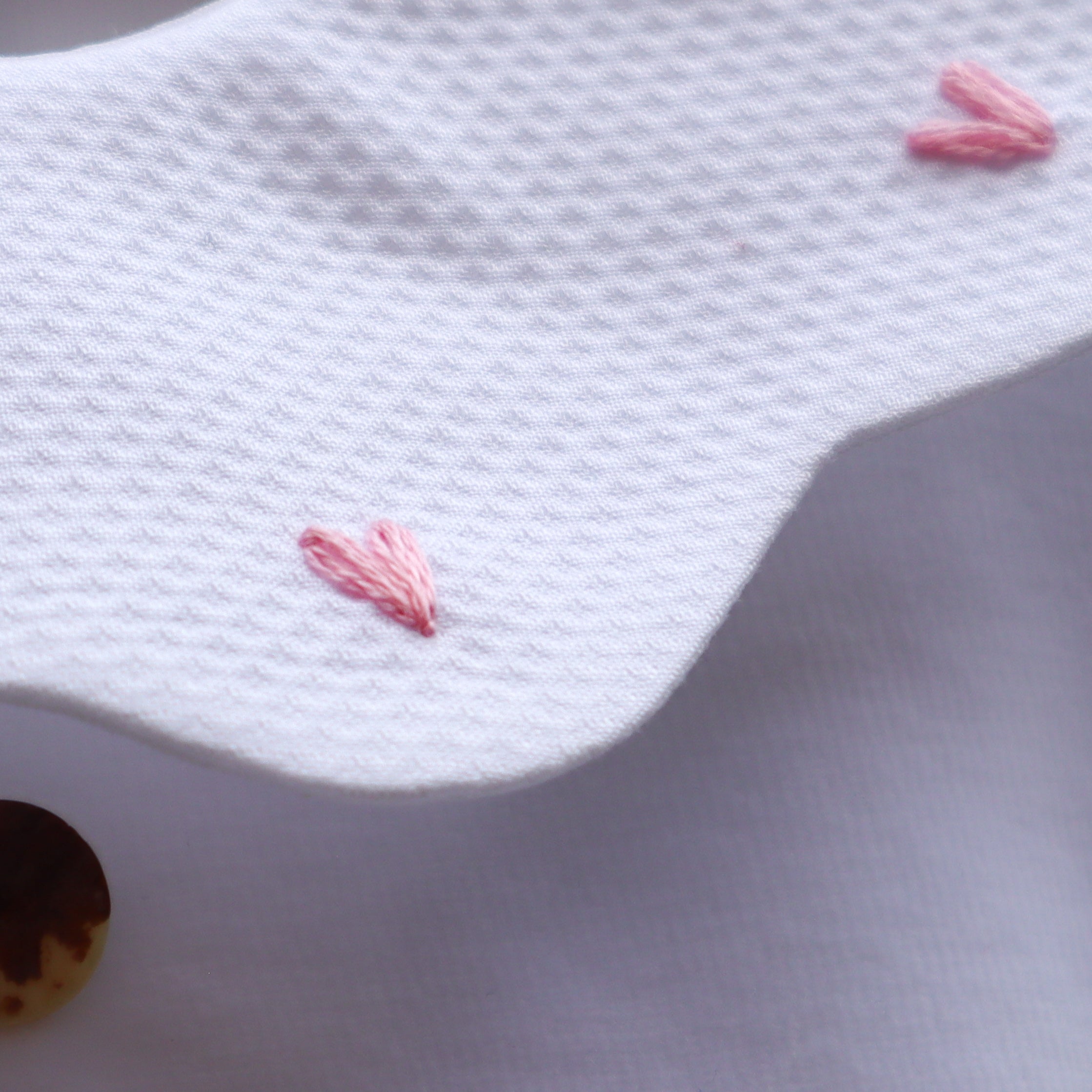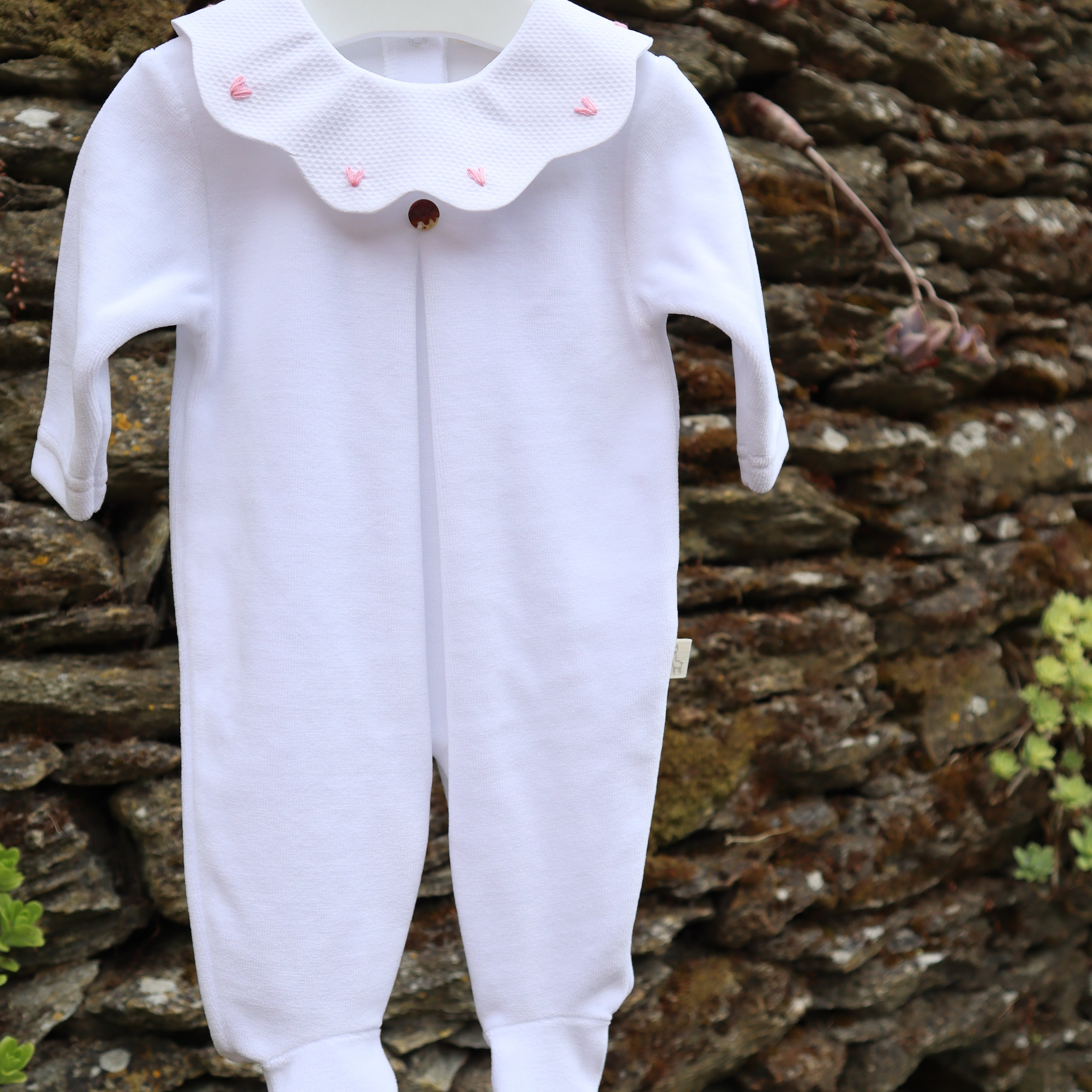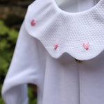 Tutina in ciniglia bianco con colletto petalo piquet ricamato con cuoricini PQ50