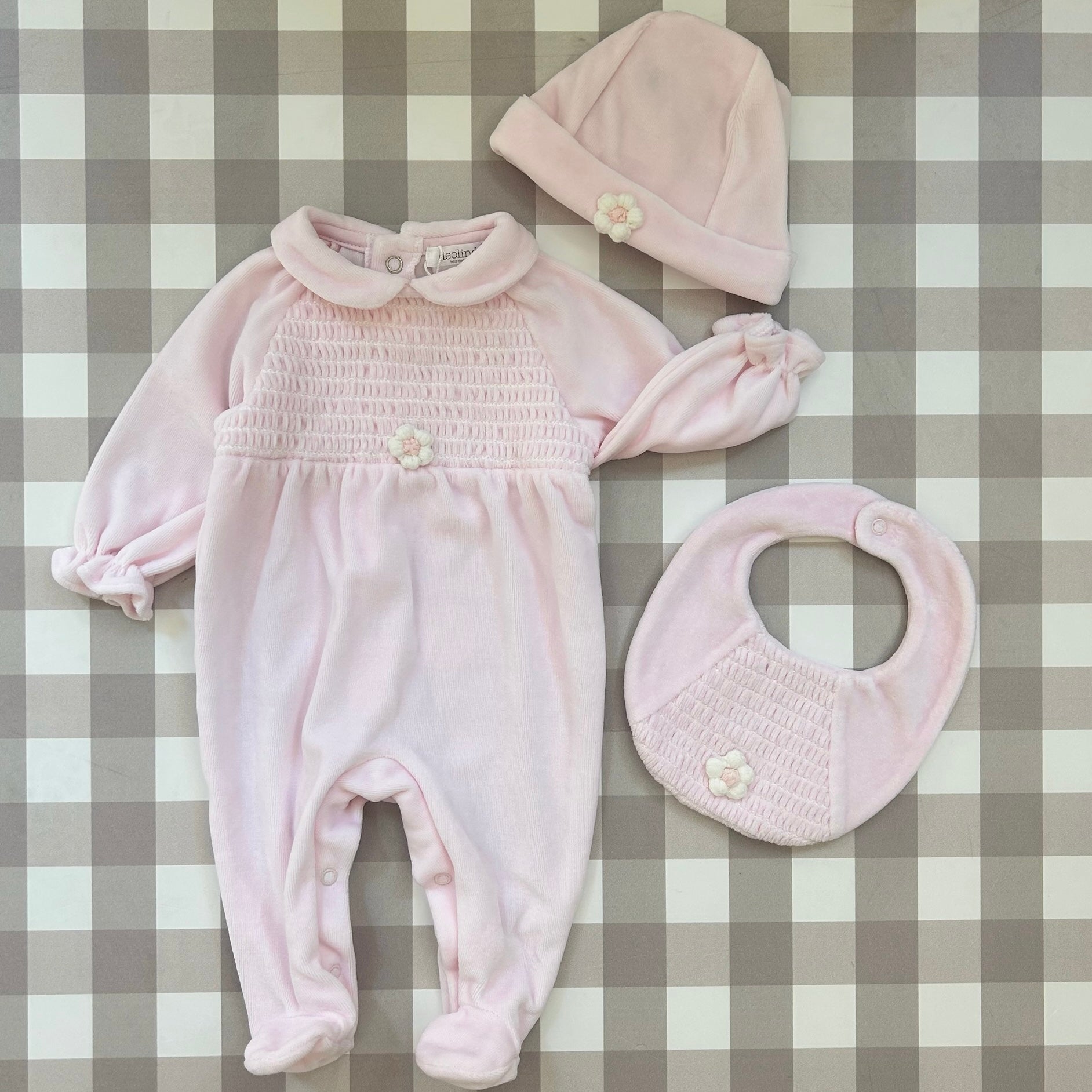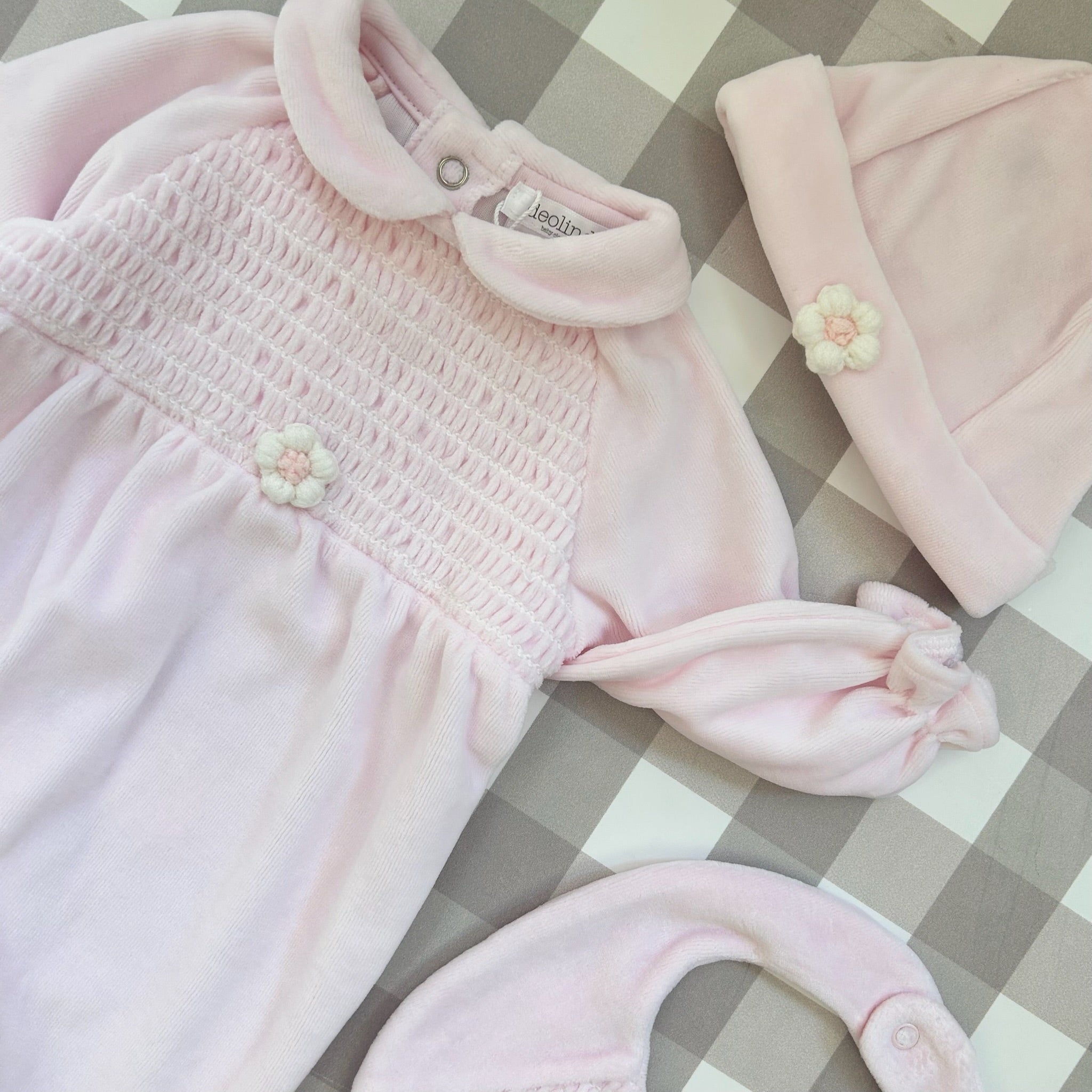 Tutina in ciniglia con colletto rotondo e fiorellino di rifinitura