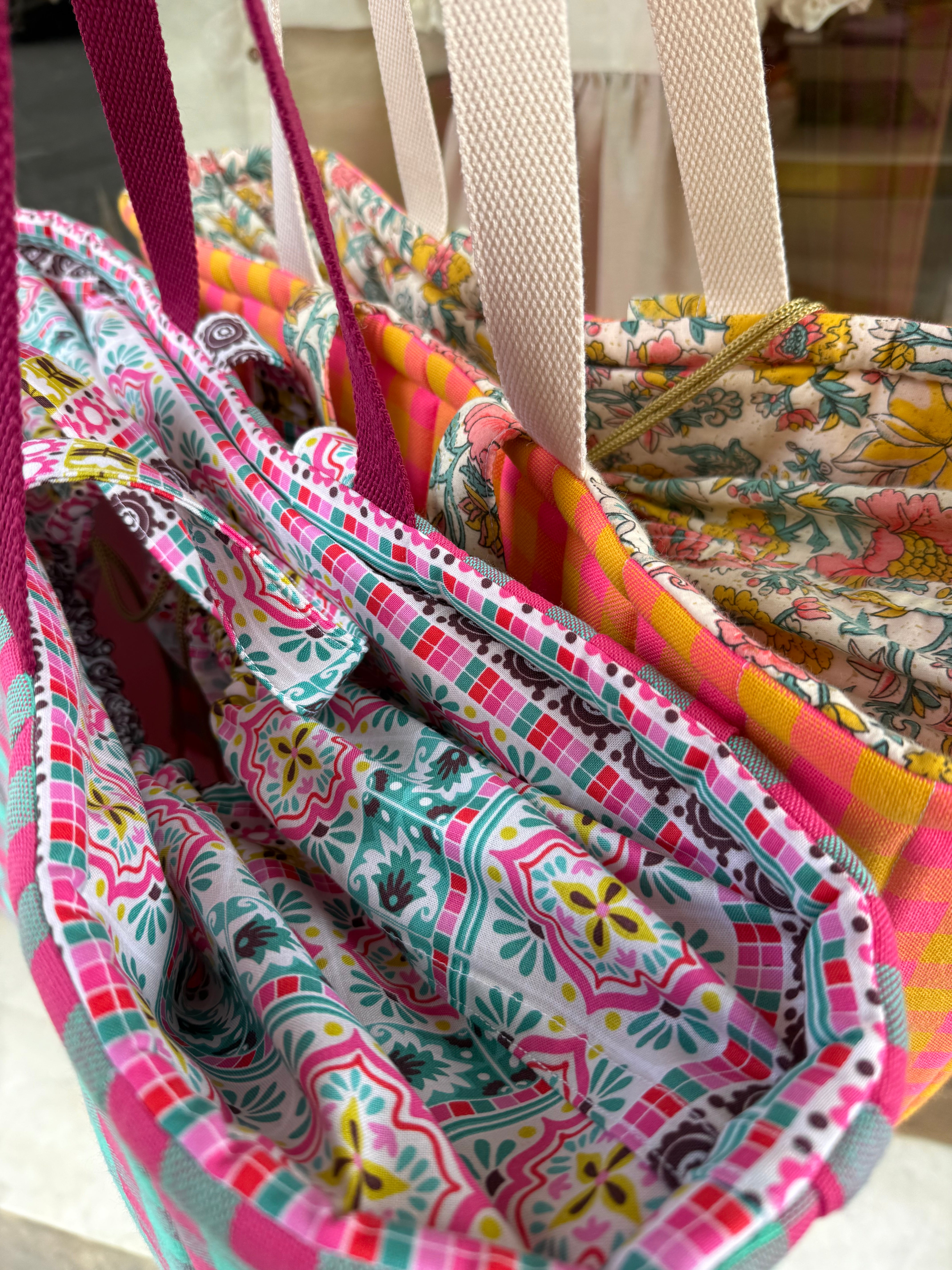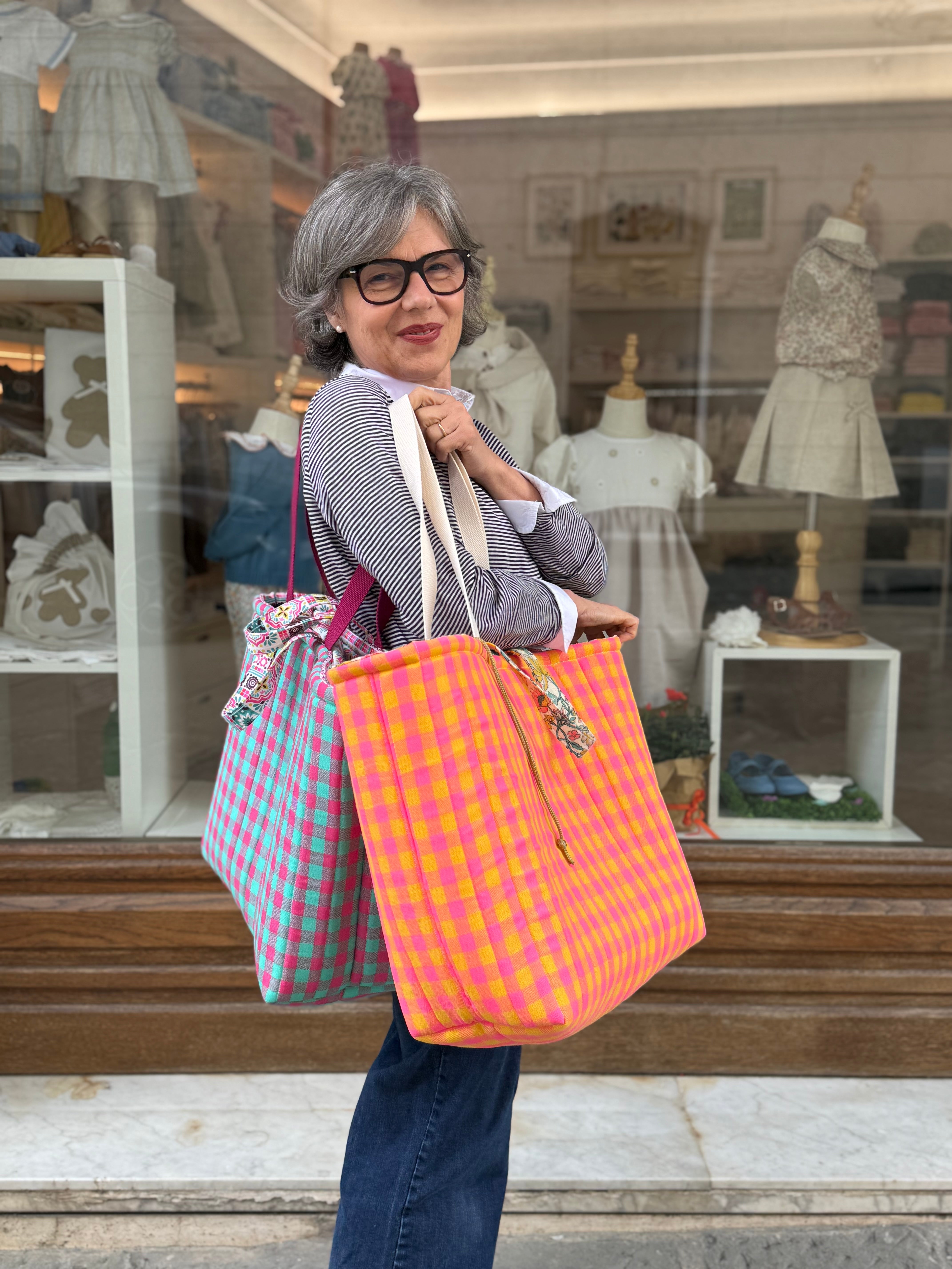 Maxi borsa in tessuto quadrettato rivestita in tessuto fantasia, con doppio manico in due lunghezze. Fodera interna in piquet con taschino interno, chiusura con coulisse